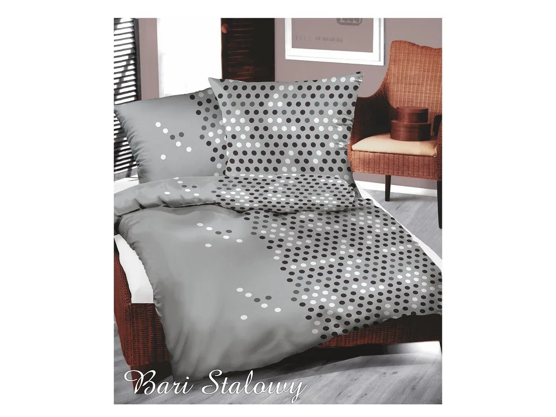 Wzór Bari Stalowy to nowoczesne, dynamiczne połączenie koloru szarego, popielatego oraz modnych grochów. Pościel z jerseyu firmy Greno będzie idealną inspiracją aby w łatwy i szybki sposób po męczącym dniu otoczyć się luksusem i pięknem pościeli.