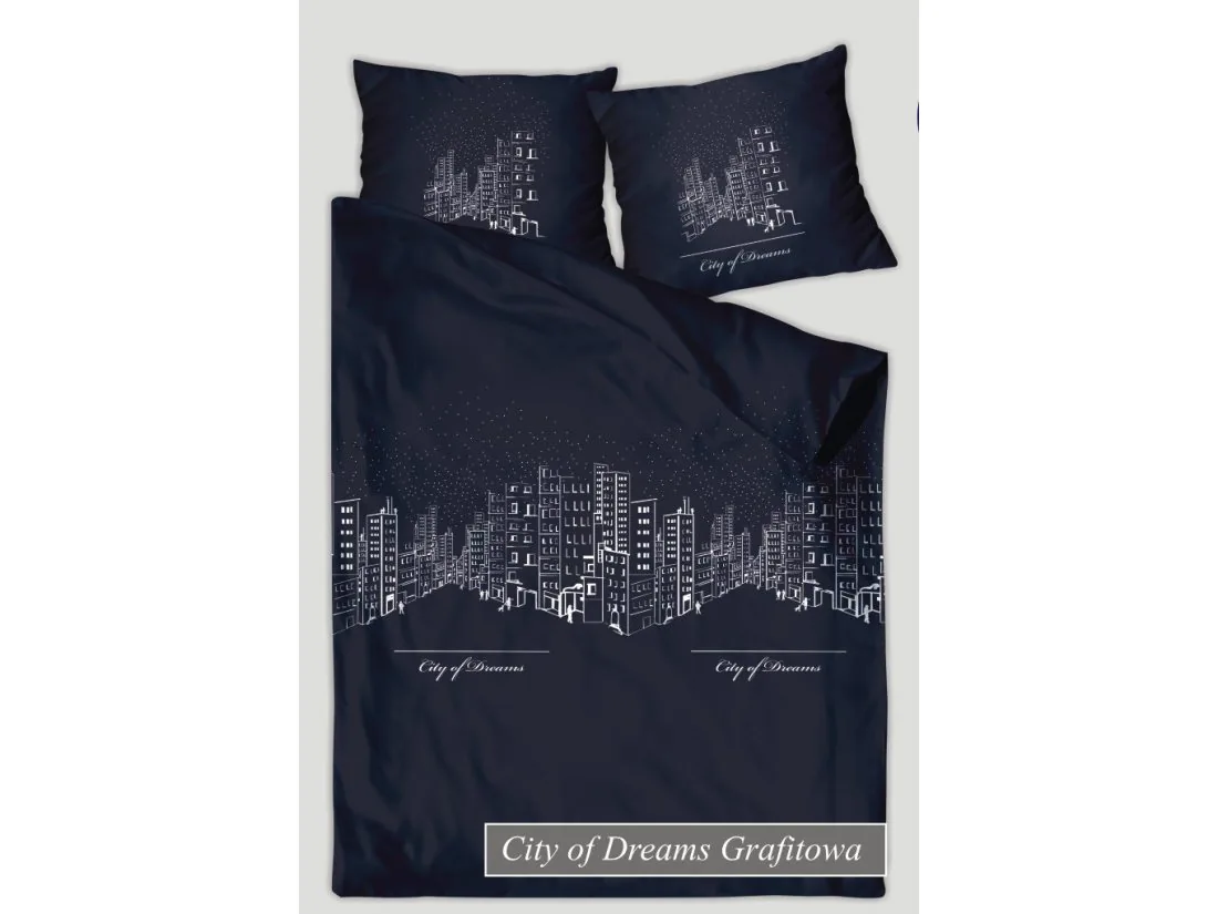 Model City of Dream urzeka wysoką jakością tkaniny delikatnym połączeniem bieli i antracytu oraz modnym motywem wielkiego miasta.