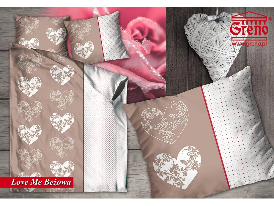 Komplet pościeli bawełnianej Bielbaw firmy Greno wzór Love Me Beżowa 220x200 to najnowsze trendy w konfekcji pościelowej oraz romantyczny wzór serduszek w modnej czerwono białej kolorystyce.
