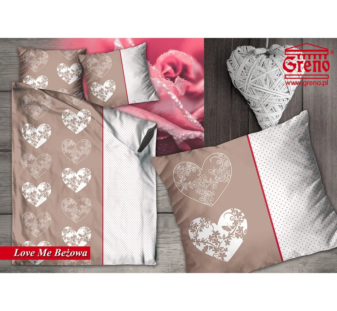 Komplet pościeli bawełnianej Bielbaw firmy Greno wzór Love Me Beżowa 160x200 to najnowsze trendy w konfekcji pościelowej oraz romantyczny wzór serduszek w modnej czerwono białej kolorystyce.