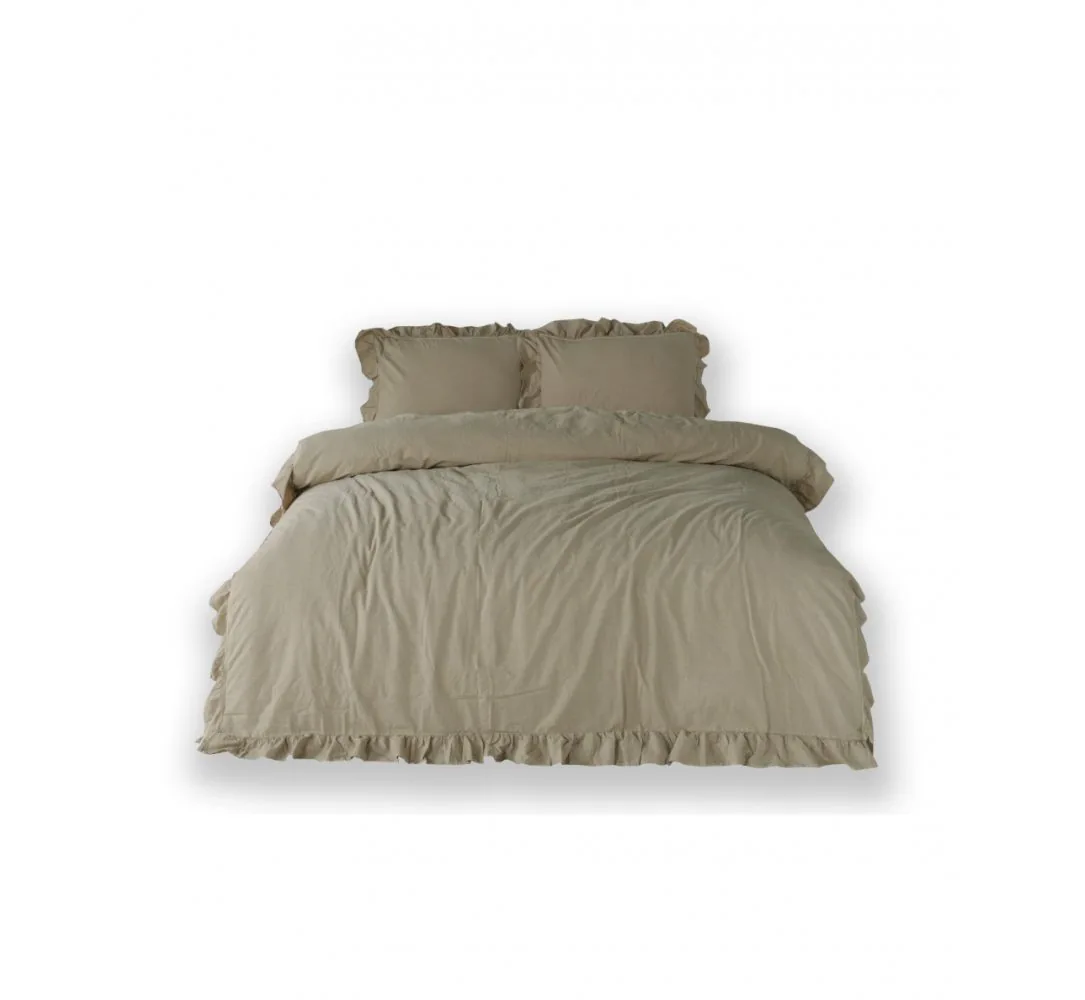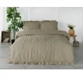 Poszwa na kołdrę została ozdobiona dekoracyjną falbanką, która dodaje elegancji i subtelności. Zapinana na guziki, pościel utrzymuje kołdrę na miejscu, zapewniając wygodę i bezpieczeństwo podczas snu. Poszewka na poduszkę posiada falbankę na czterech stronach, co nadaje jej delikatny i romantyczny wygląd. Poszewka zapinana jest na zakładkę, co sprawia, że wkładka pozostaje na miejscu i nie przesuwa się podczas snu.