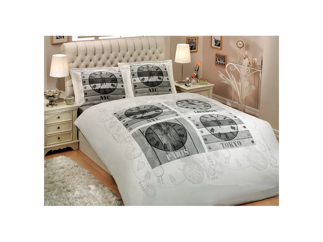 Gustowne połączenie barw w odcieniu grafitu, szarości oraz modnym wzorem z motywem zegarów komplet pościeli tworzy piękną kompozycje, która niewątpliwie zapewni każdej sypialni niecodzienny charakter oraz wyjątkowy urok.