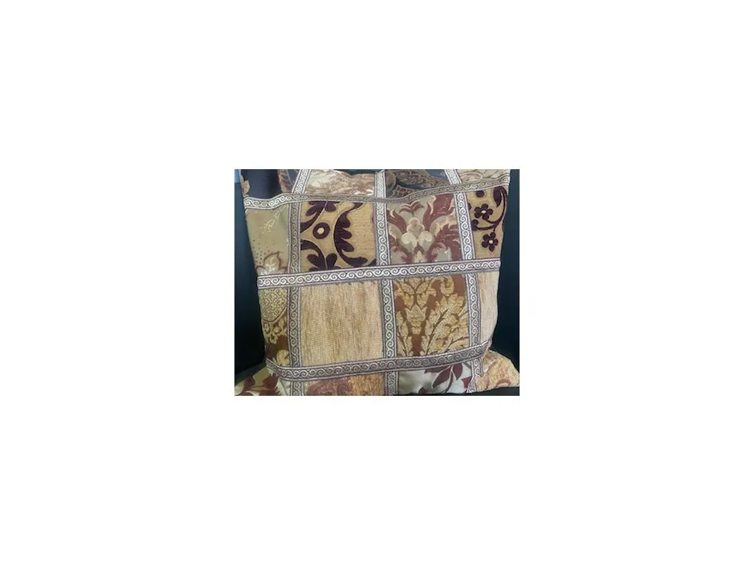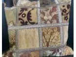 Poszewka dekoracyjna gobelinowa w rozmiarze 40x40 cm, typu jaś została wykonana z tkaniany 100 % poliester w kolorze brązowo złotym wzór patchwork. Poszewka jednostronna zapinana na zamek, z drugiej strony tkanina w kolorze czarnym.