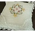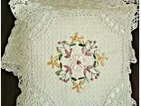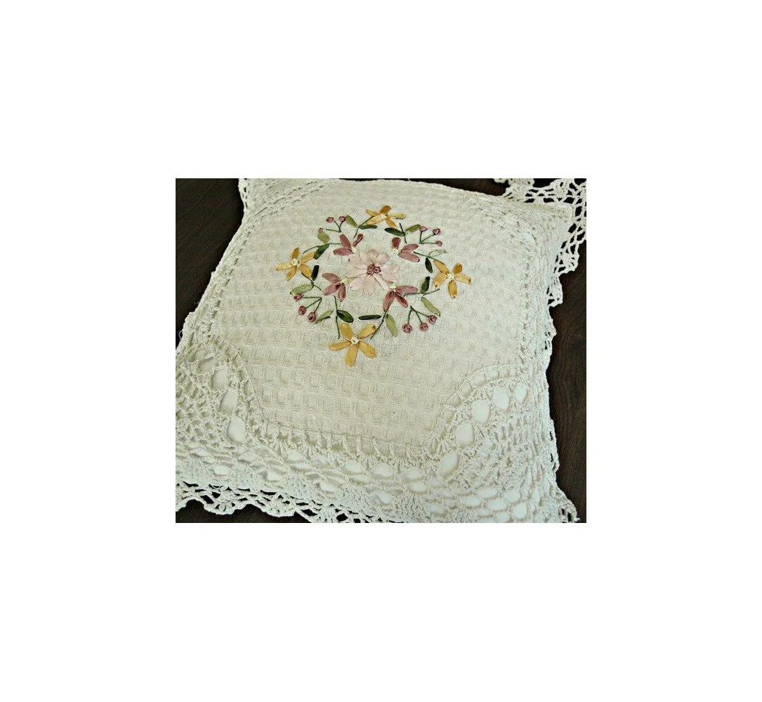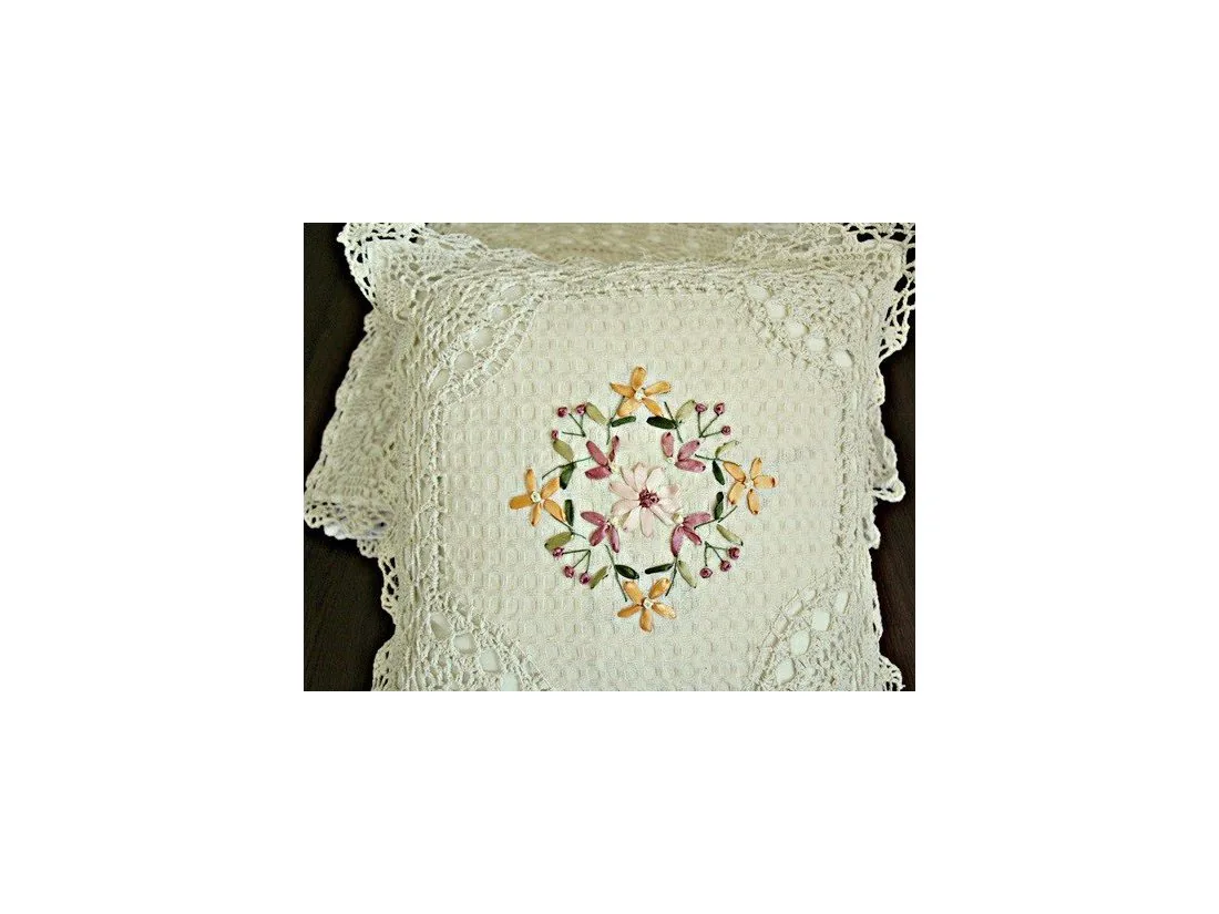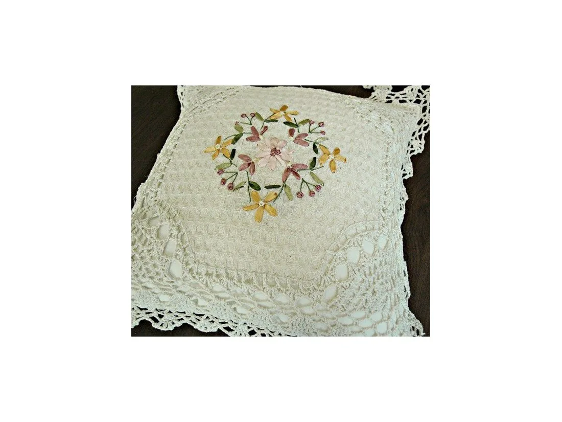 Poszewka dekoracyjna szydełko Ecru w rozmiarze 40x40 zdobiona wstążka z motywem kwiatowym.