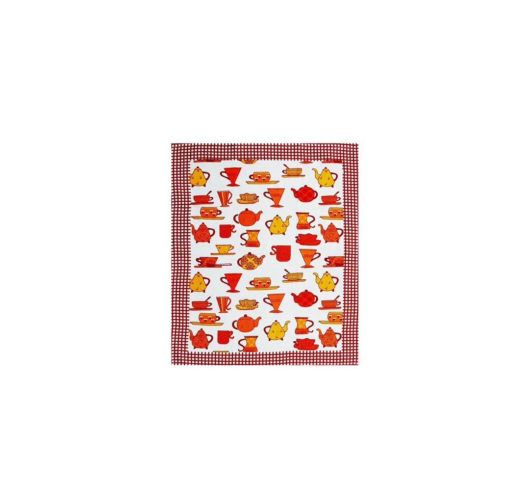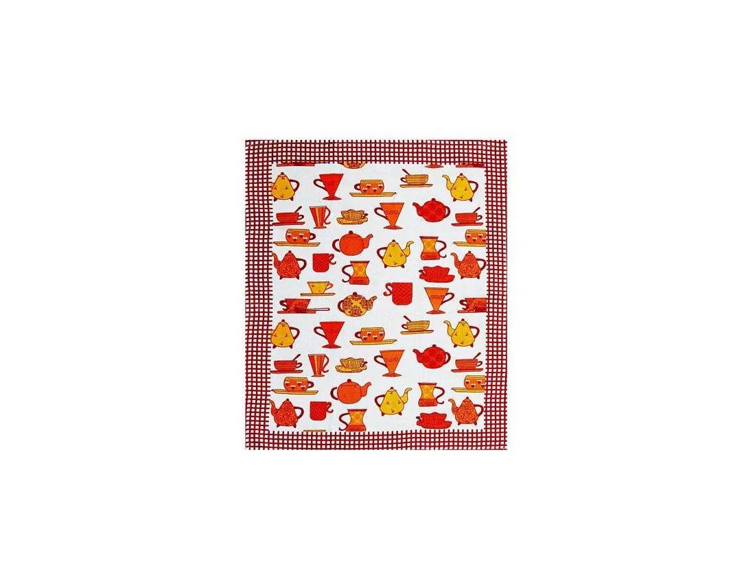 Ściereczka z nadrukiem w fliżanki jest w kolorze rudo ceglanym.