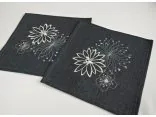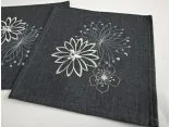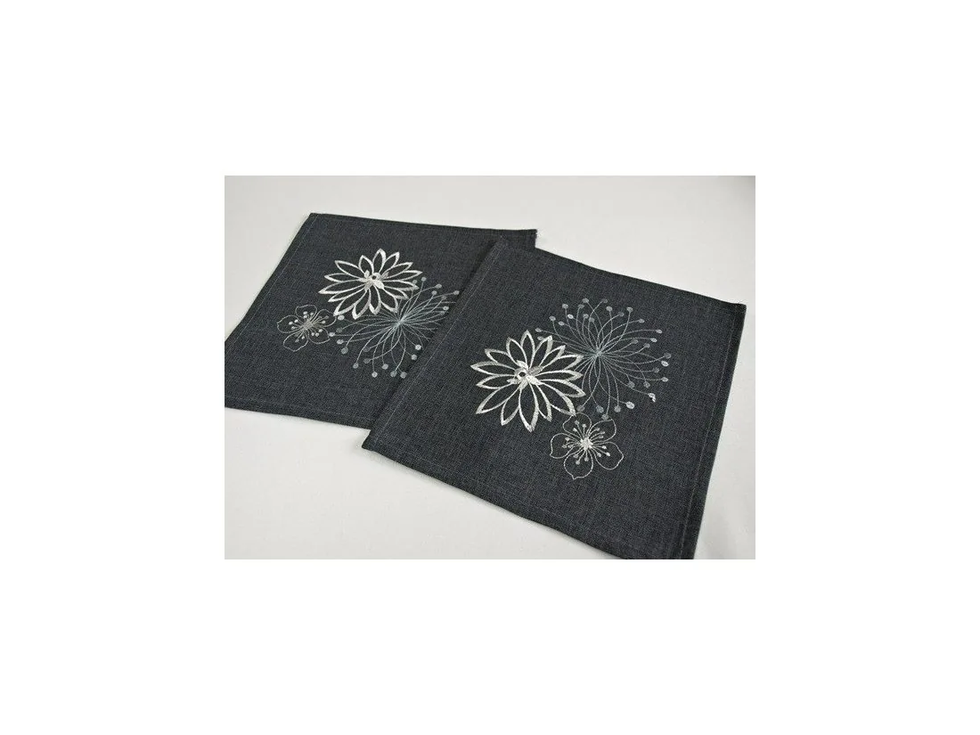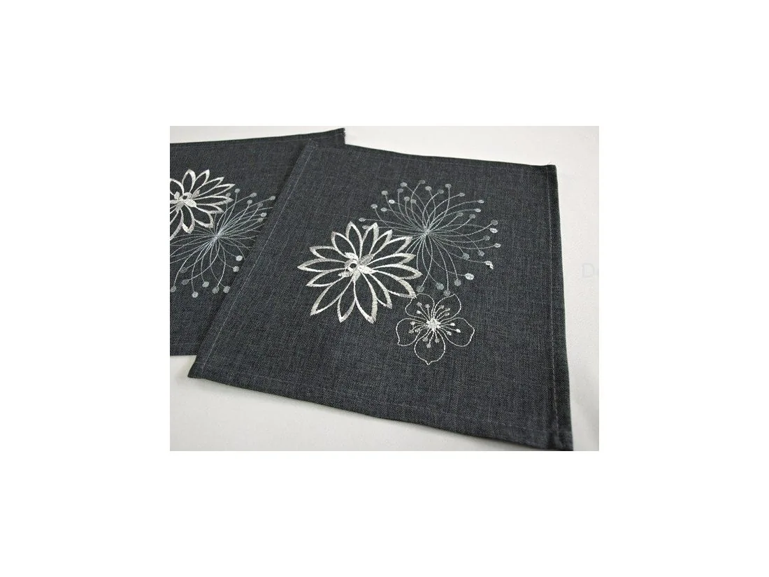 Serwetka haftowana w rozmiarze 25x25 cm została wykonana z tkaniny 100 % poliestrowej w kolorze grafitowym z aplikacja haftu delikatnych kwiatuszków.