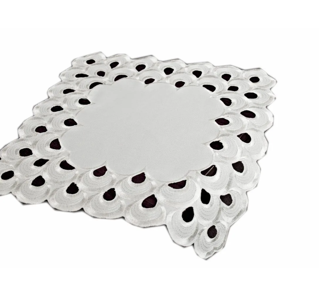 Dekoracyjna haftowana serwetka w rozmiarze 30 x 30 cm w kolorze jasno kremowym.
