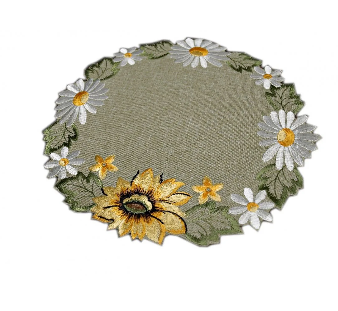 Haftowany serwetka o średnicy 25 cm w kolorze zielonkawym z haftowanymi słonecznikami, białymi margaretkami.