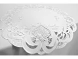 Haftowana okrągła serwetka w rozmiarze śr. 40 cm w kolorze białym z motywem kwiatowym została wykonana z tkaniny 100 % poliestrowej.