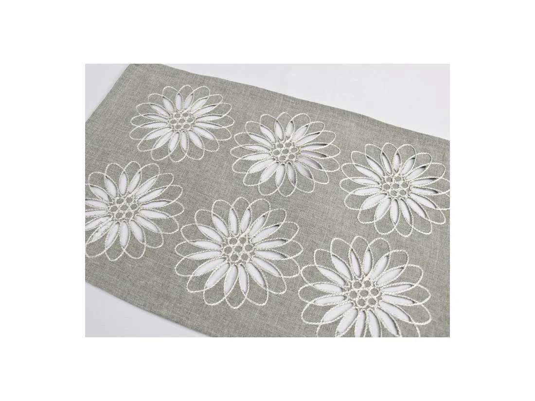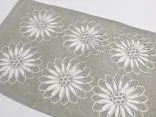 Haftowany bieżnik w rozmiarze 25 x 40 cm w kolorze szarym z jasno szarym kwiatowym haftem.