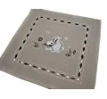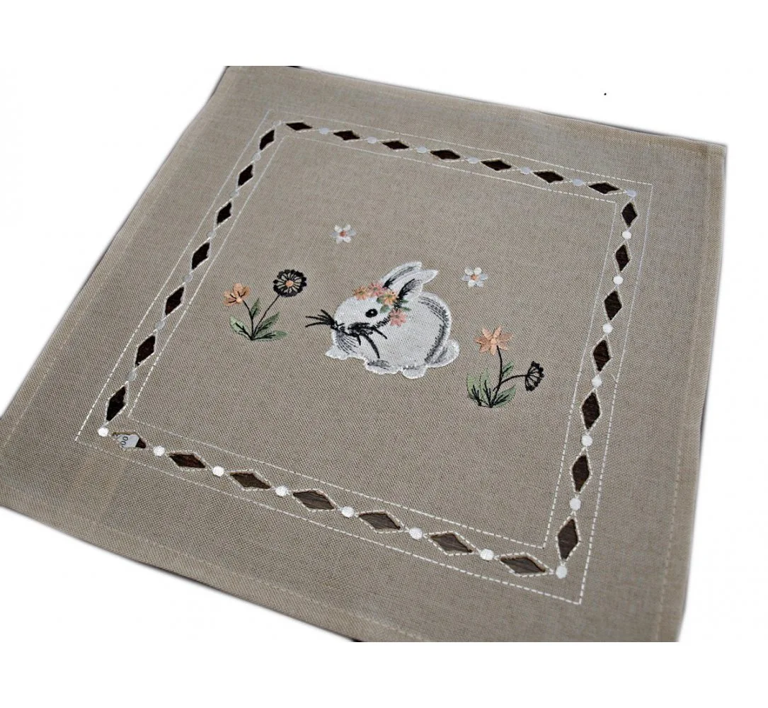 serwetka świąteczna w rozmiarze 30x30 cm w kolorze beżowym z aplikacja zajączka w białym kolorze, została wykonana z tkaniny 100 % poliestrowej, charakteryzuje się nowoczesnym desingiem, świątecznym nastrojowym wzorem oraz modnym kolorem dodatkową ozdobą jest haft wokół serwetki.