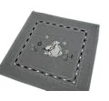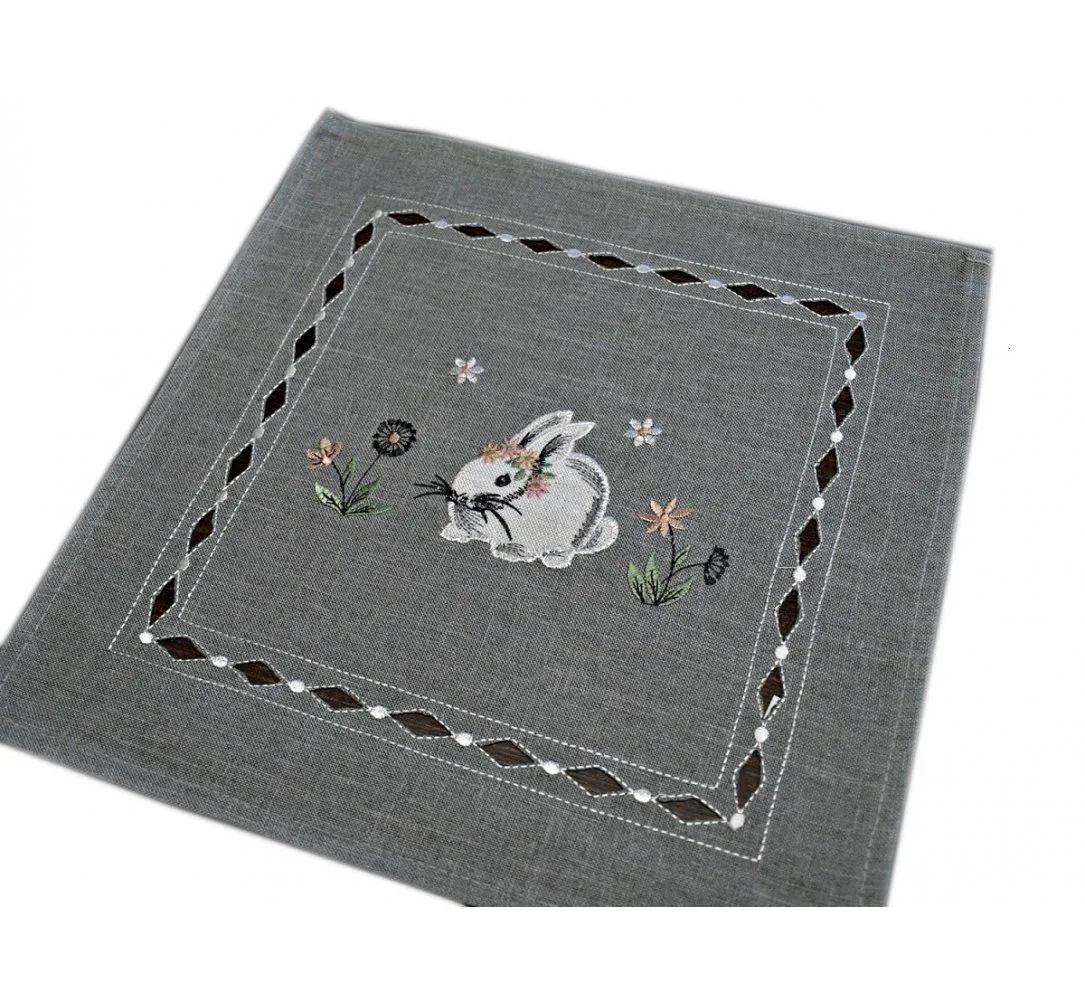 serwetka świąteczna w rozmiarze 30x30 cm w kolorze szarym z aplikacja zajączka w białym kolorze, została wykonana z tkaniny 100 % poliestrowej, charakteryzuje się nowoczesnym desingiem, świątecznym nastrojowym wzorem oraz modnym kolorem dodatkową ozdobą jest haft wokół serwetki.