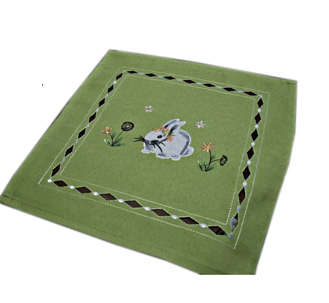 serwetka świąteczna w rozmiarze 30x30 cm w kolorze zielonym z aplikacja zajączka w białym kolorze, została wykonana z tkaniny 100 % poliestrowej, charakteryzuje się nowoczesnym desingiem, świątecznym nastrojowym wzorem oraz modnym kolorem dodatkową ozdobą jest haft wokół serwetki.