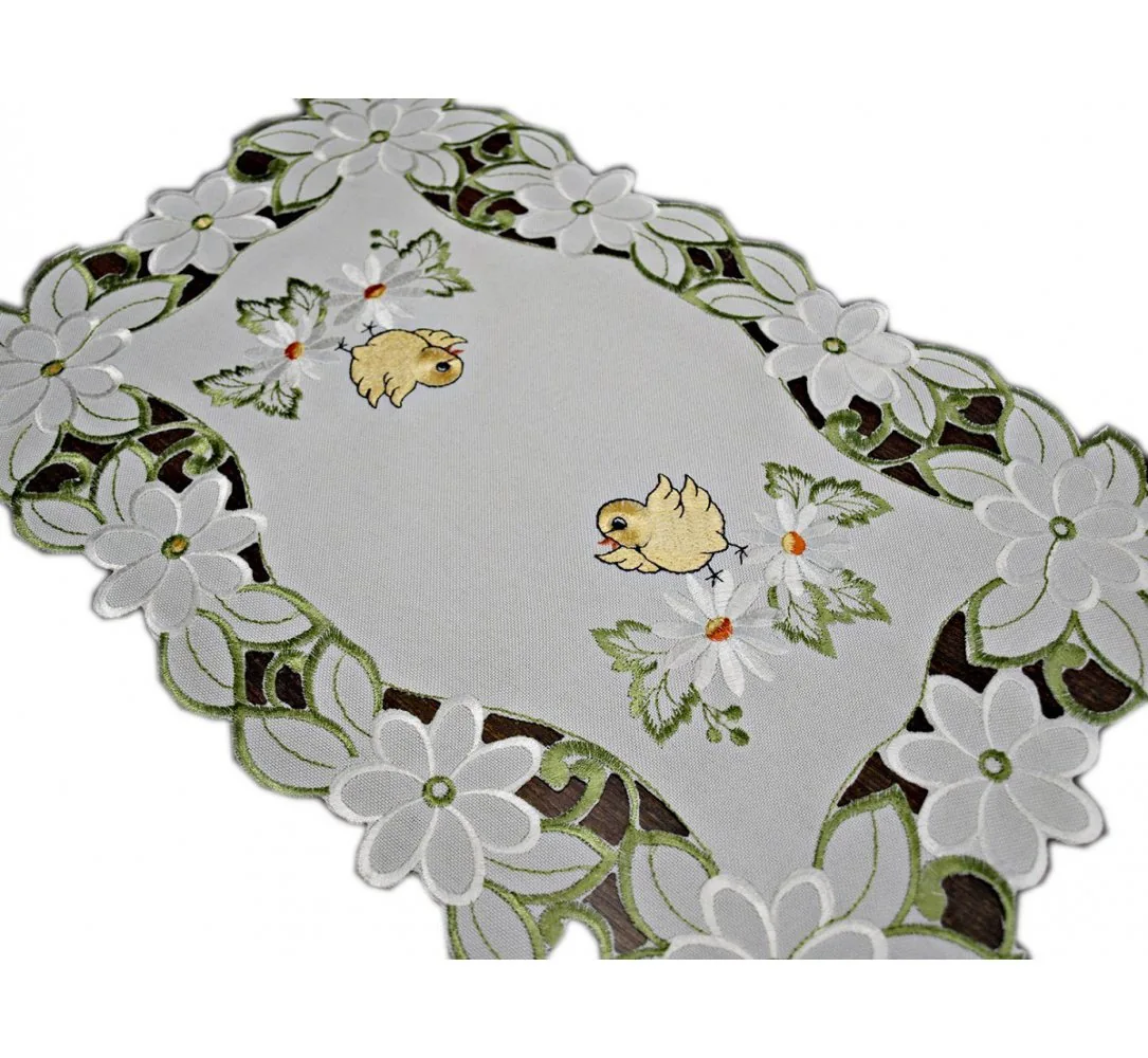 Nakładka świąteczna w rozmiarze 30x45 cm w kolorze białym z haftowanymi kurczaczkami oraz wiosennymi kwiatkami została wykonana z tkaniny 100 % poliestrowej, charakteryzuje się nowoczesnym desingiem, świątecznym nastrojowym wzorem oraz modnym kolorem dodatkową ozdobą jest haft wokół serwetki.