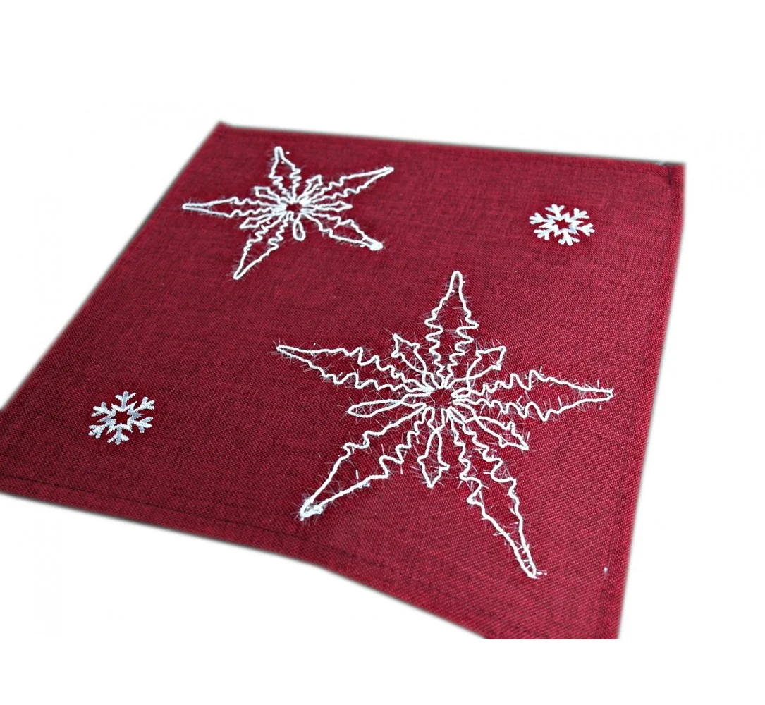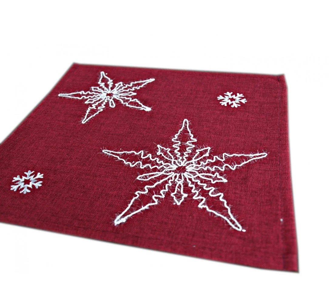 Aplikacja haftu na serwetce świątecznej jest motyw białych gwiazdek, śnieżynek.