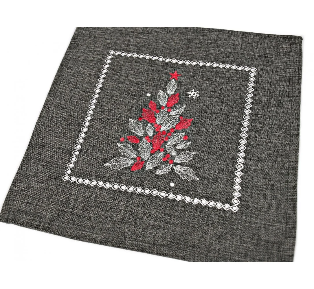 Serwetka świąteczna w rozmiarze 25 x 25 cm w kolorze grafitowym z aplikacja haftowanej choinki w kolorze czerwono srebrnym.