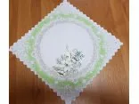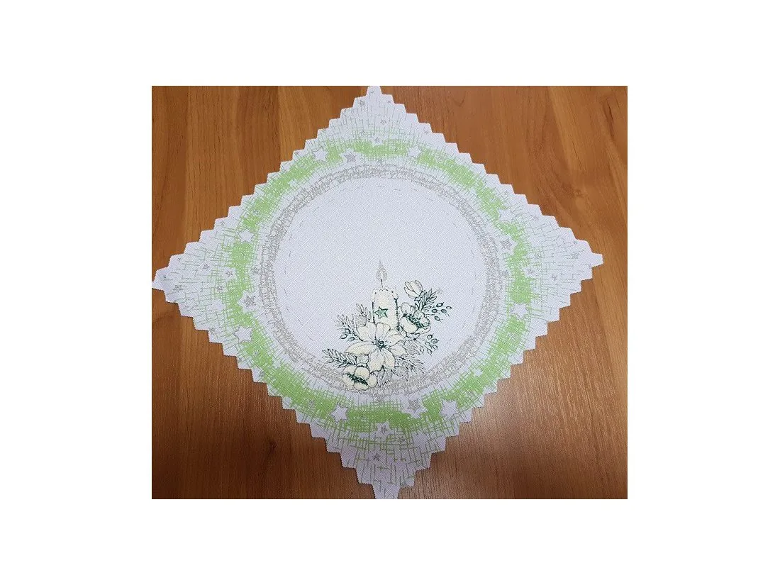 Serwetka świąteczna w rozmiarze 30 x 30 cm w kolorze białym z nadrukiem stroika świątecznego w kolorze zielono srebrnym, została wykonana z tkaniny 100 % poliestrowej, charakteryzuje się nowoczesnym desingiem, prostym wzornictwem oraz modnym kolorem.
