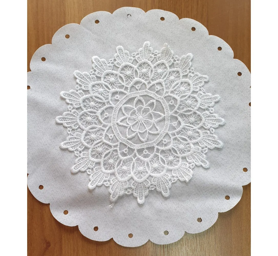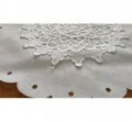 Serwetka świąteczna o średnicy 40 cm w kolorze białym z naszytą koronką została wykonana na tkaninie lurex* - 100 % poliestrowej, charakteryzuje się nowoczesnym desingiem, prostym wzorem oraz modnym kolorem.