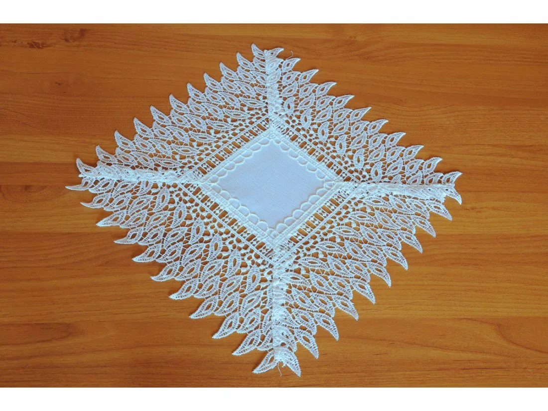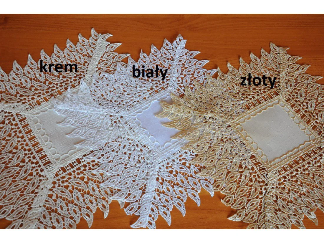 Serwetka z gipiurą jest łatwa w utrzymaniu, nie wymaga mocnego prasowania, koronka po praniu nie ulega kurczeniu się.