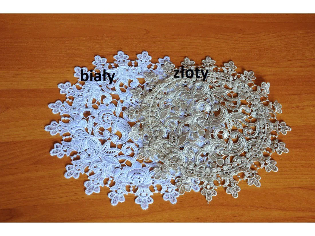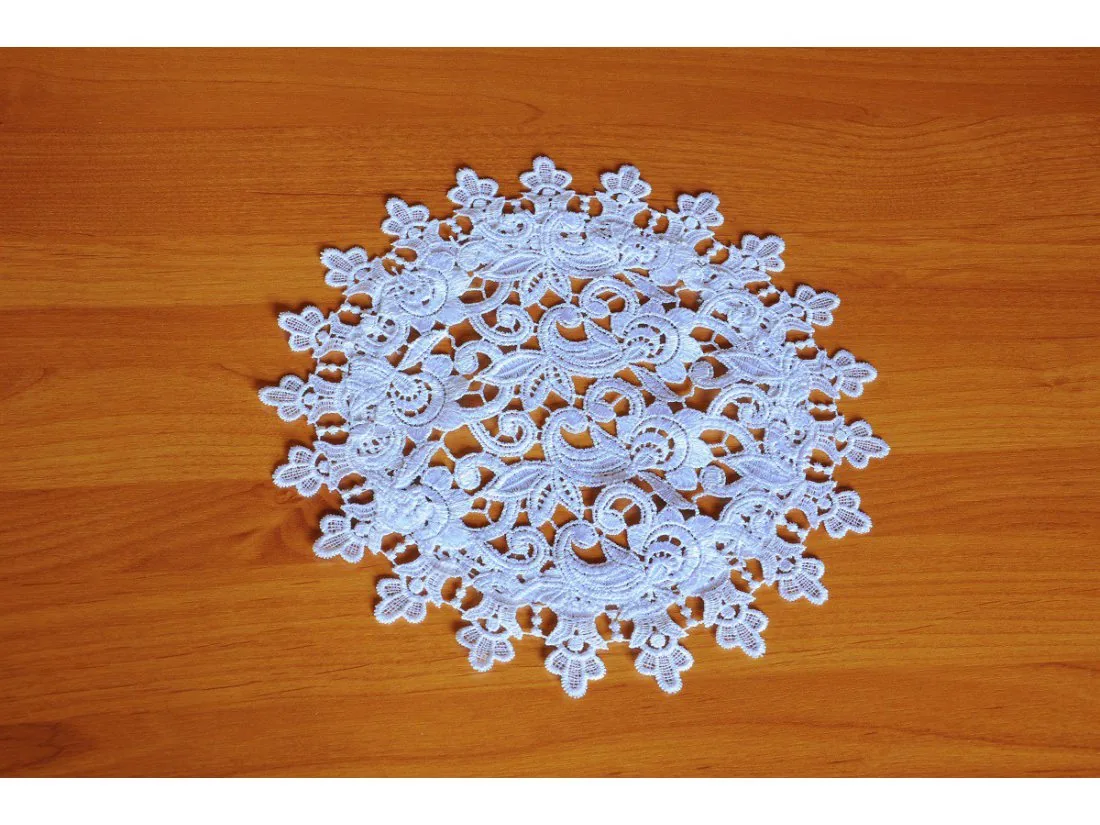 Serwetka z gipiurą o średnicy 25 cm została wykonana z tkaniny poliestrowej w kolorze białym.