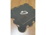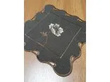Serwetka haftowana w rozmiarze 25x25 cm została wykonana z tkaniny 100 % poliestrowej w kolorze brązowym z aplikacja haftu róży.