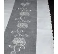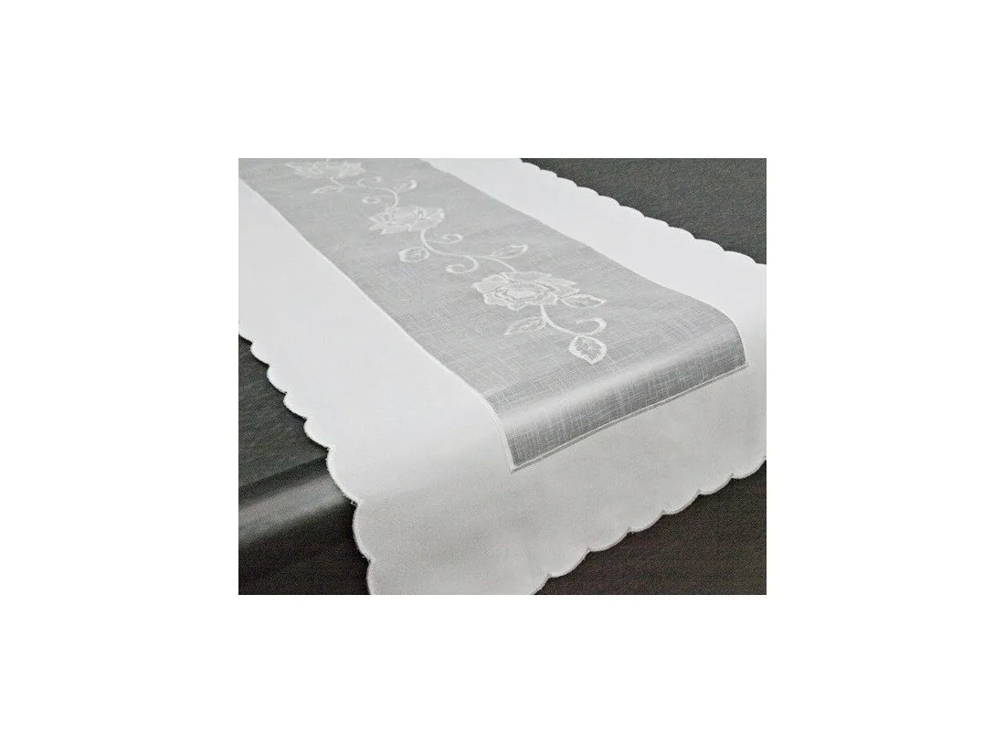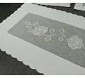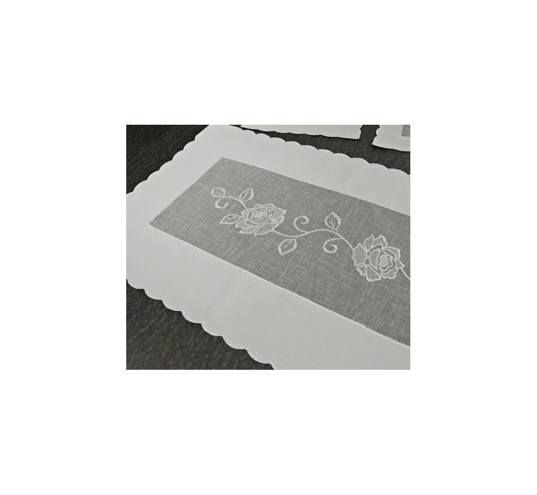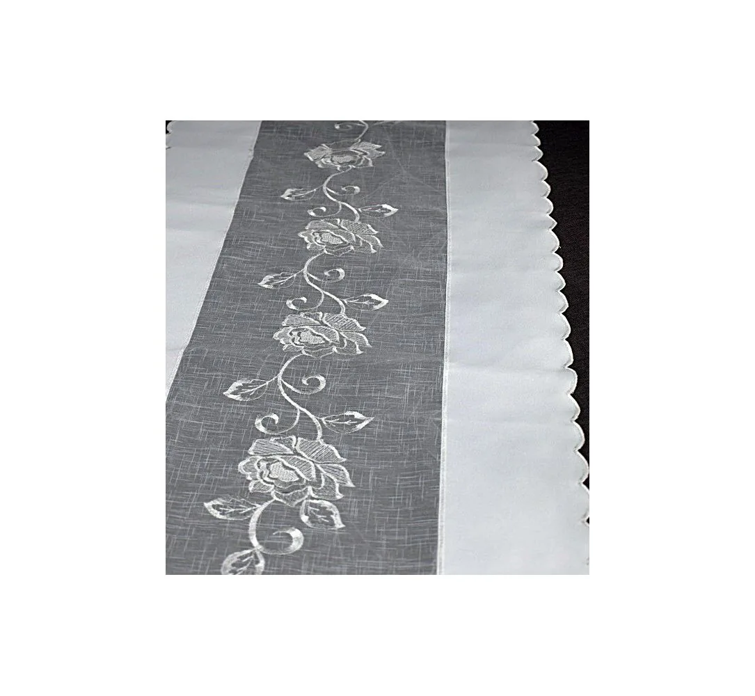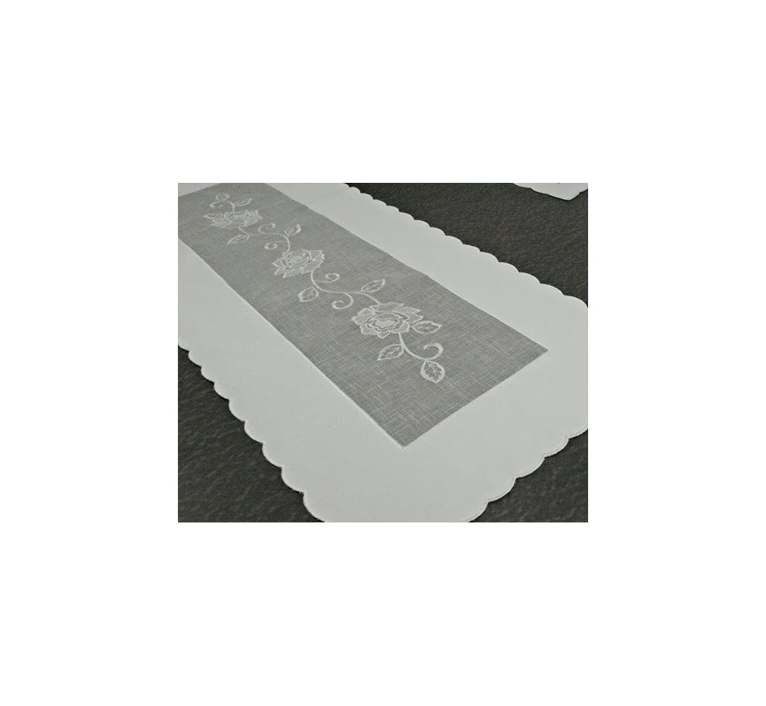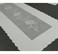 Bieżnik z haftem 40x140 cm został wykonany z wysokiej jakości tkaniny poliestrowej, dzięki starannemu połączeniu tkaniny z woalem oraz delikatnym haftem w kolorze białym z motywem delikatnej róży nakładka będzie ozdobą każdego wnętrza.