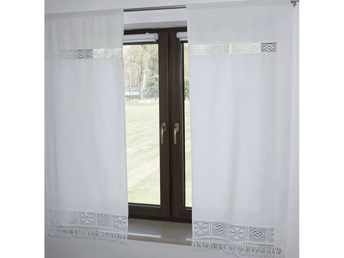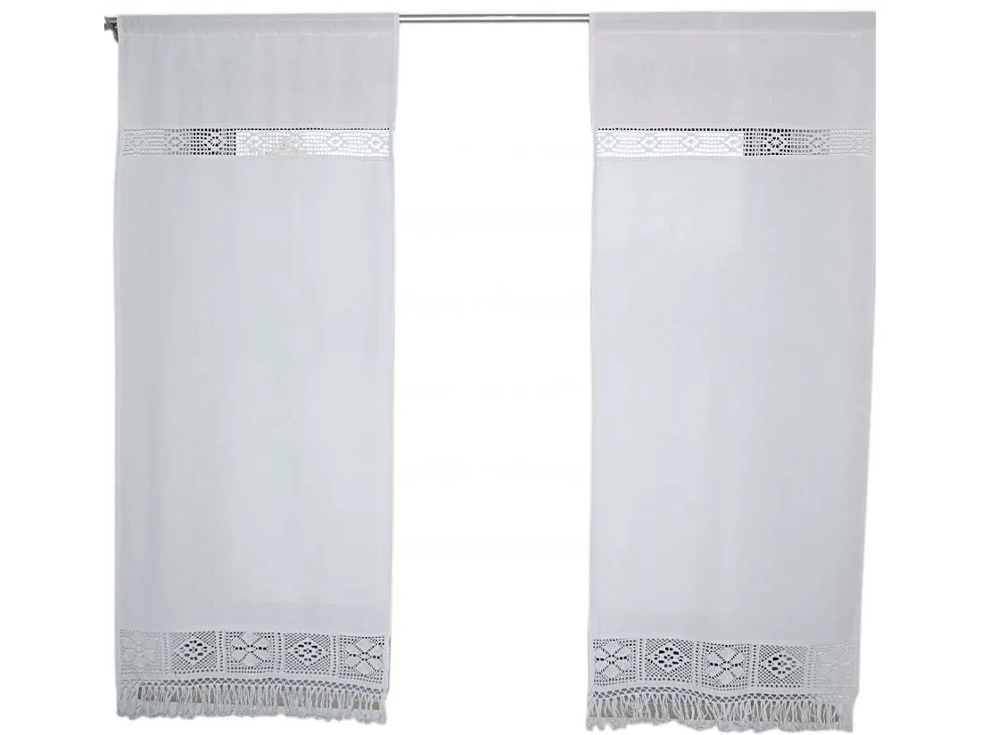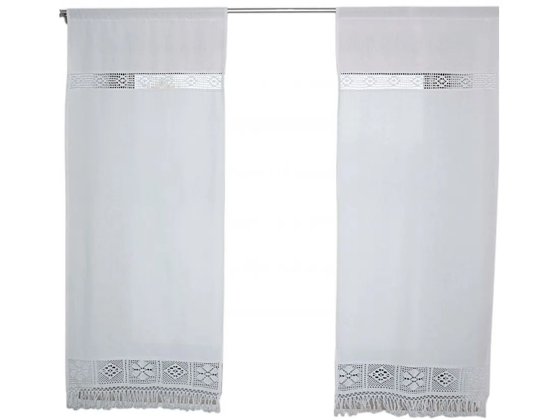 Dekoracyjna zasłonka w rozmiarze 150x60 cm /wys/dł/ w kolorze białym wykończona ozdobną koronką oraz frędzlami, nada niepowtarzalny klimat każdej jadalni, kuchni.