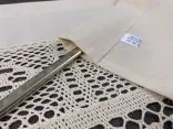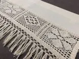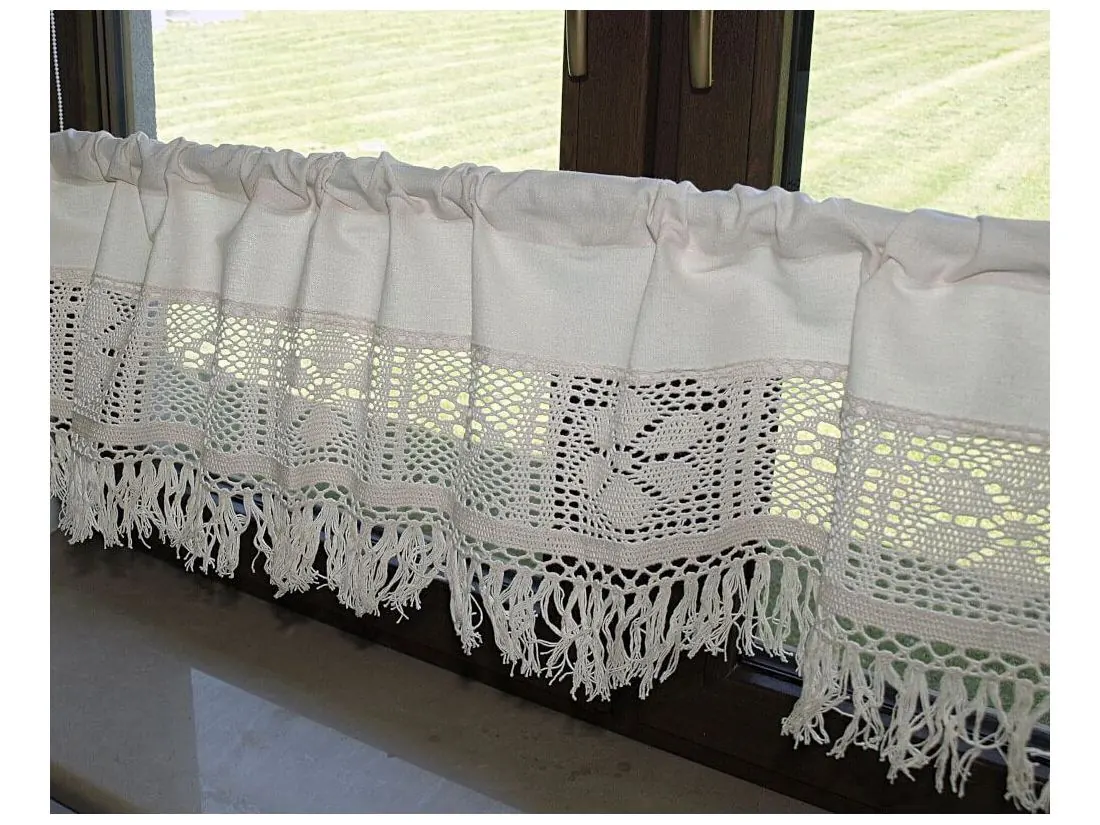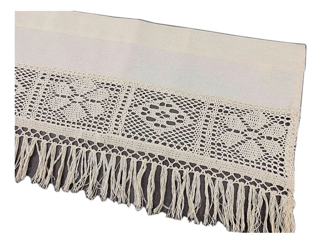 Dekoracyjna zazdrostka w rozmiarze 30 x 150 cm /wys/dł/ w kolorze Beżowym wykończona ozdobną koronką oraz frędzlami, nada niepowtarzalny klimat każdej jadalni, kuchni.