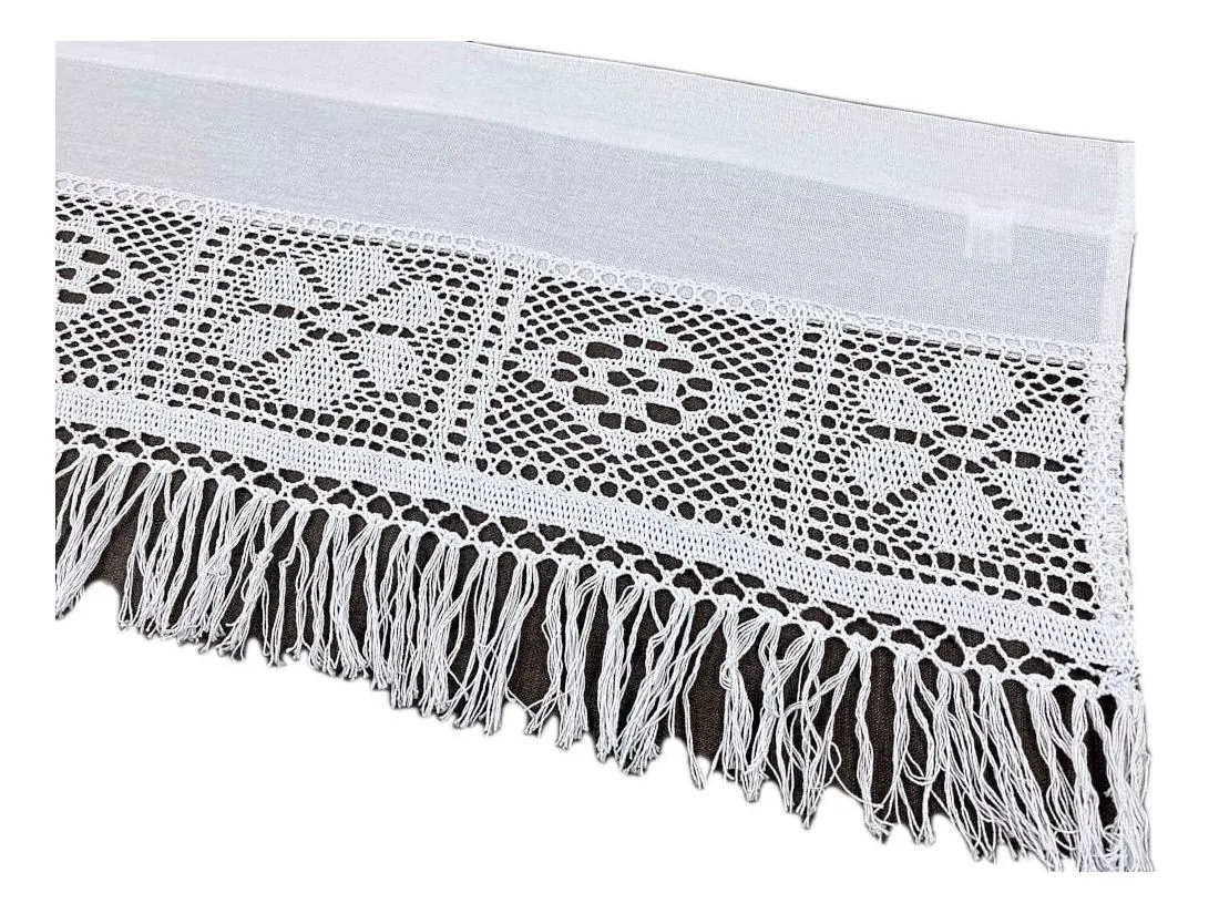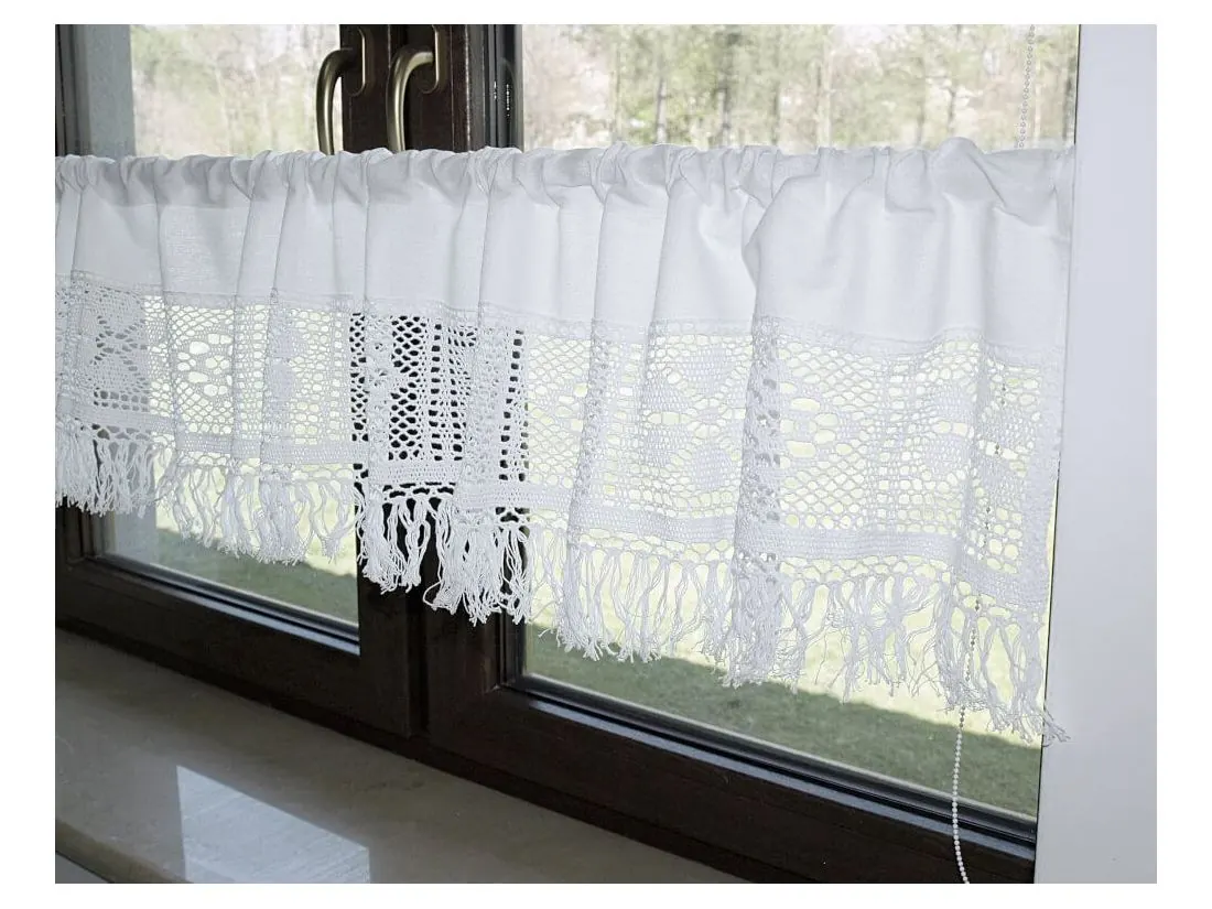 Dekoracyjna zazdrostka w rozmiarze 30 x 150 cm /wys/dł/ w kolorze Białym wykończona ozdobną koronką oraz frędzlami, nada niepowtarzalny klimat każdej jadalni, kuchni.