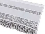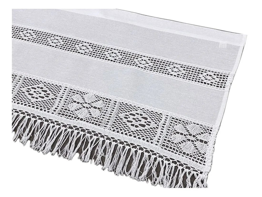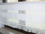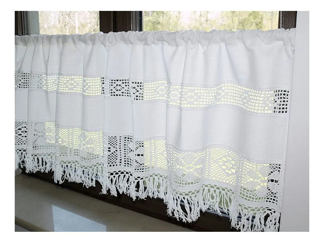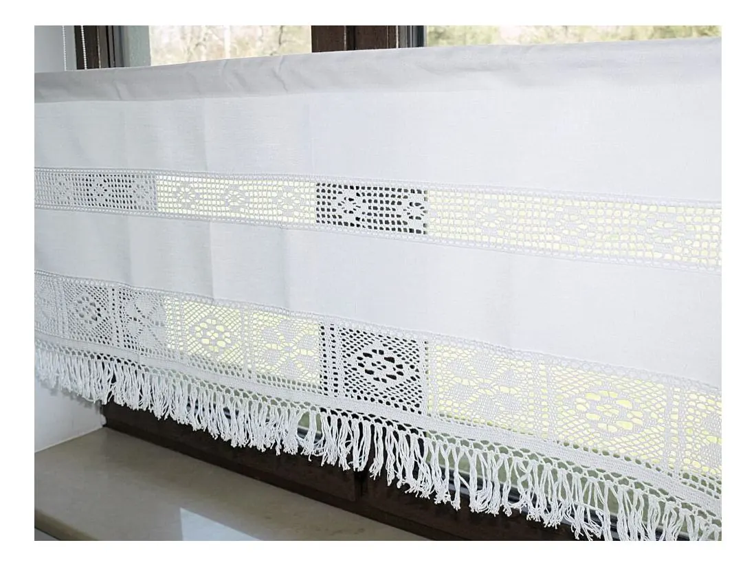 Dekoracyjna zazdrostka w rozmiarze 50 x 200 cm /wys/dł/ w kolorze Białym wykończona ozdobną koronką oraz frędzlami, nada niepowtarzalny klimat każdej jadalni, kuchni.