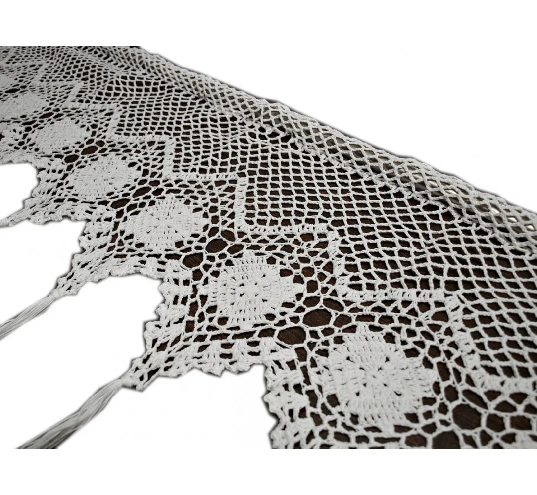 Dekoracyjna zazdrostka ręcznie robiona w rozmiarze 30 x 150 cm /wys/dł/ w kolorze białym nada niepowtarzalny klimat każdej jadalni, kuchni. Wysokość firanki mierzona jest do szpica zazdrostki, dolana dekoracja tj frędzle można bezinwazyjnie wyciągnąć nadając inny wizerunek zazdrostki.