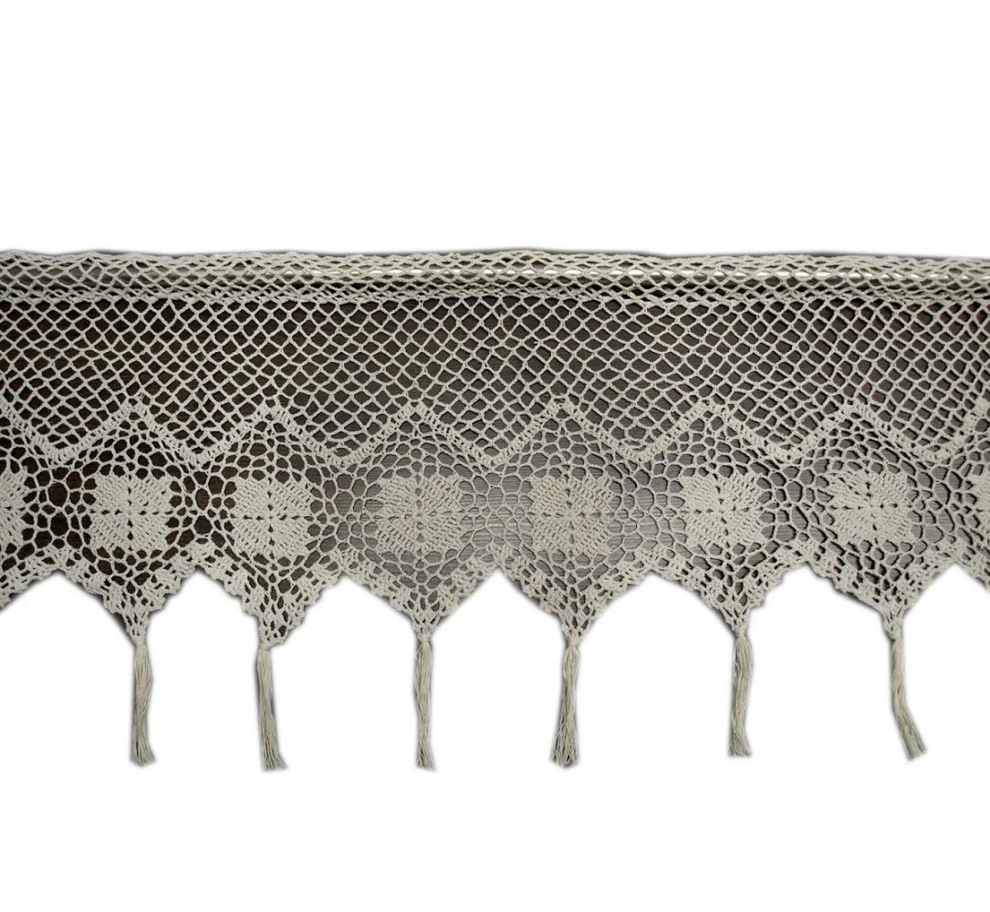 Dekoracyjna zazdrostka ręcznie robiona w rozmiarze 30 x 100 cm /wys/dł/ w kolorze ecru nada niepowtarzalny klimat każdej jadalni, kuchni. Wysokość firanki mierzona jest do szpica zazdrostki, dolana dekoracja tj frędzle można bezinwazyjnie wyciągnąć nadając inny wizerunek zazdrostki.