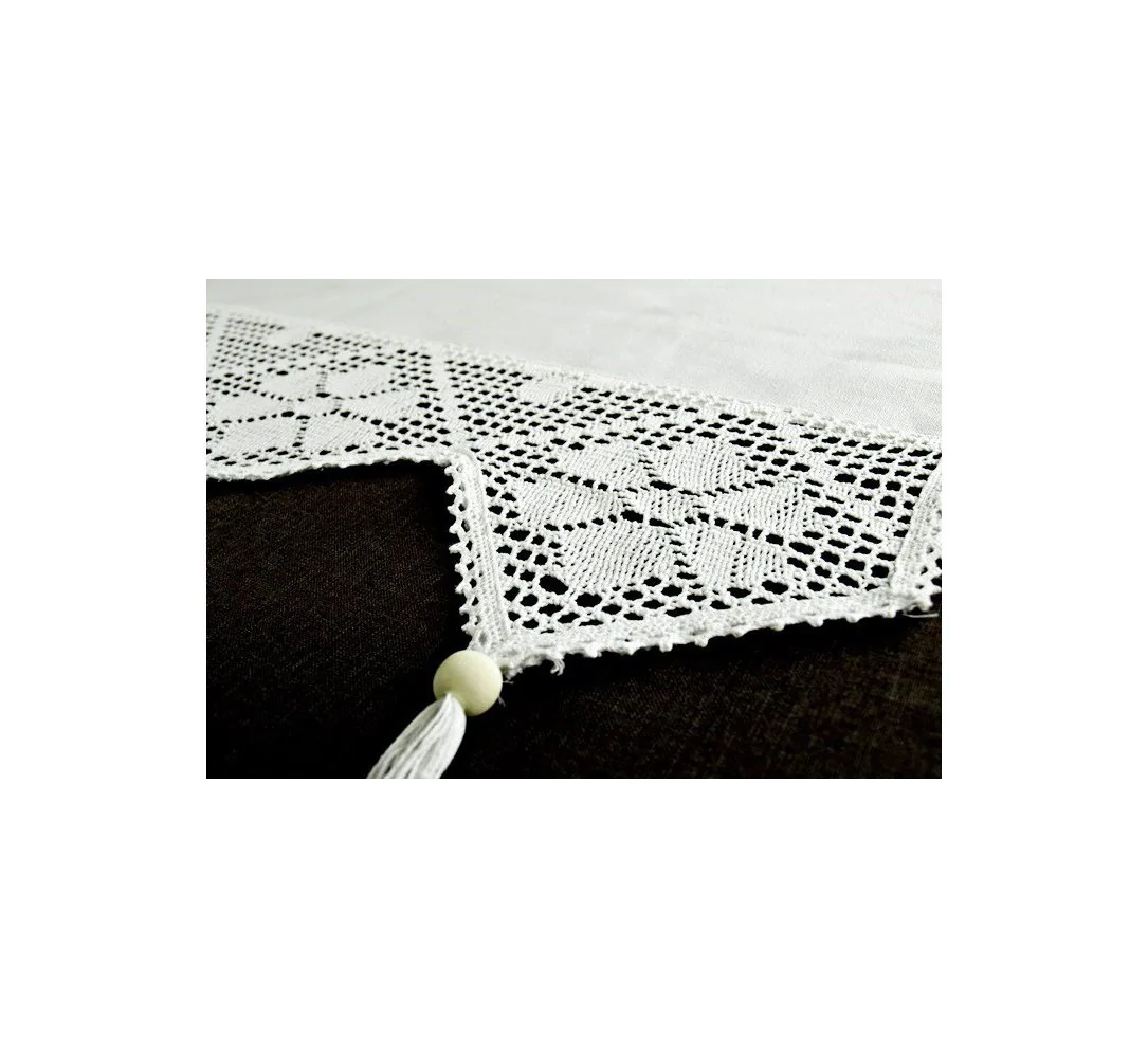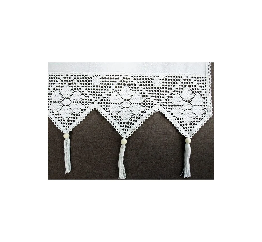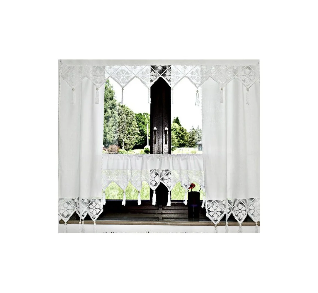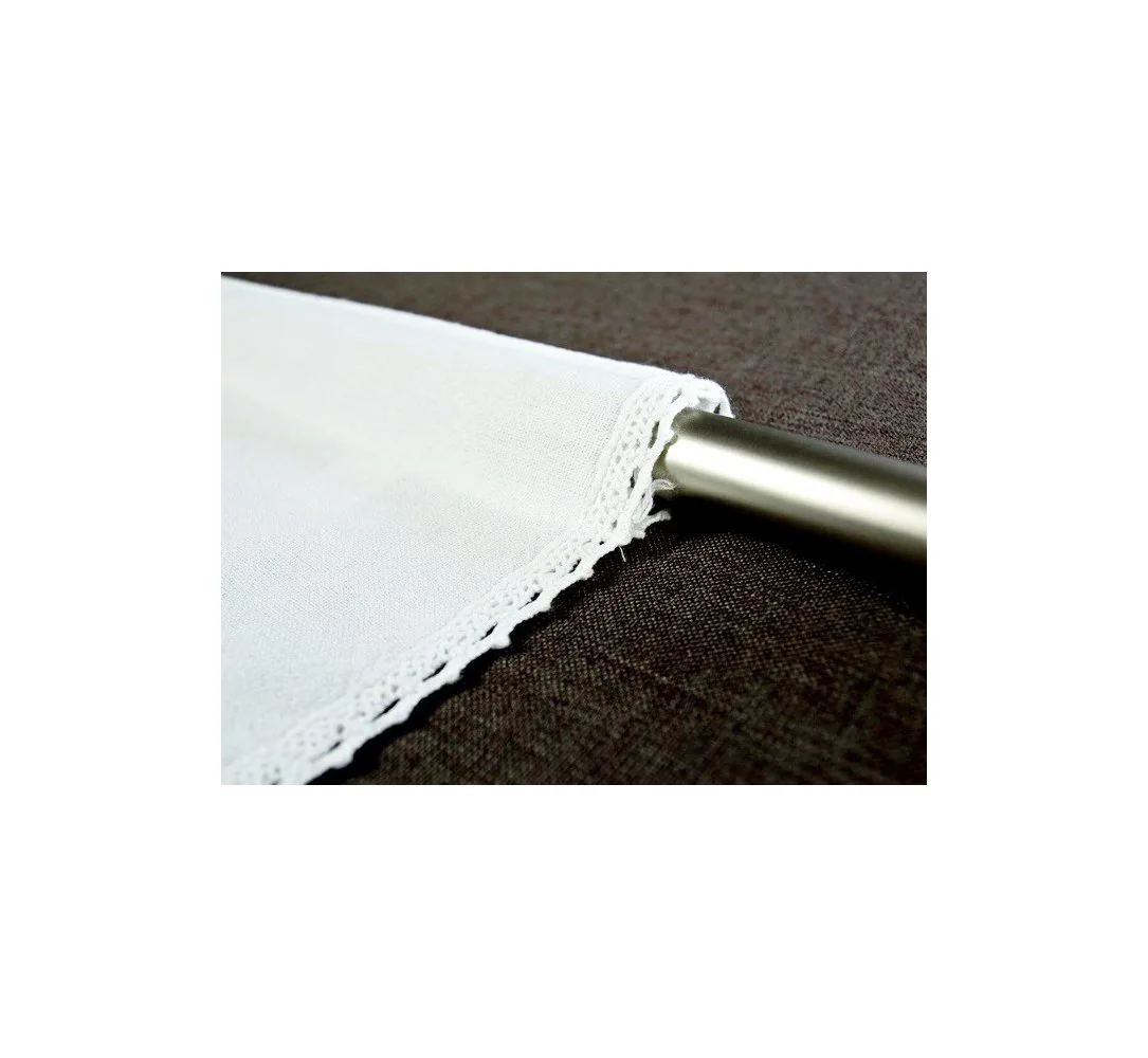 Dekoracyjna zazdrostka w rozmiarze 30 x 200 cm /wys/dł/ w kolorze białym wykończona ozdobną koronką nada niepowtarzalny klimat każdej jadalni, kuchni.