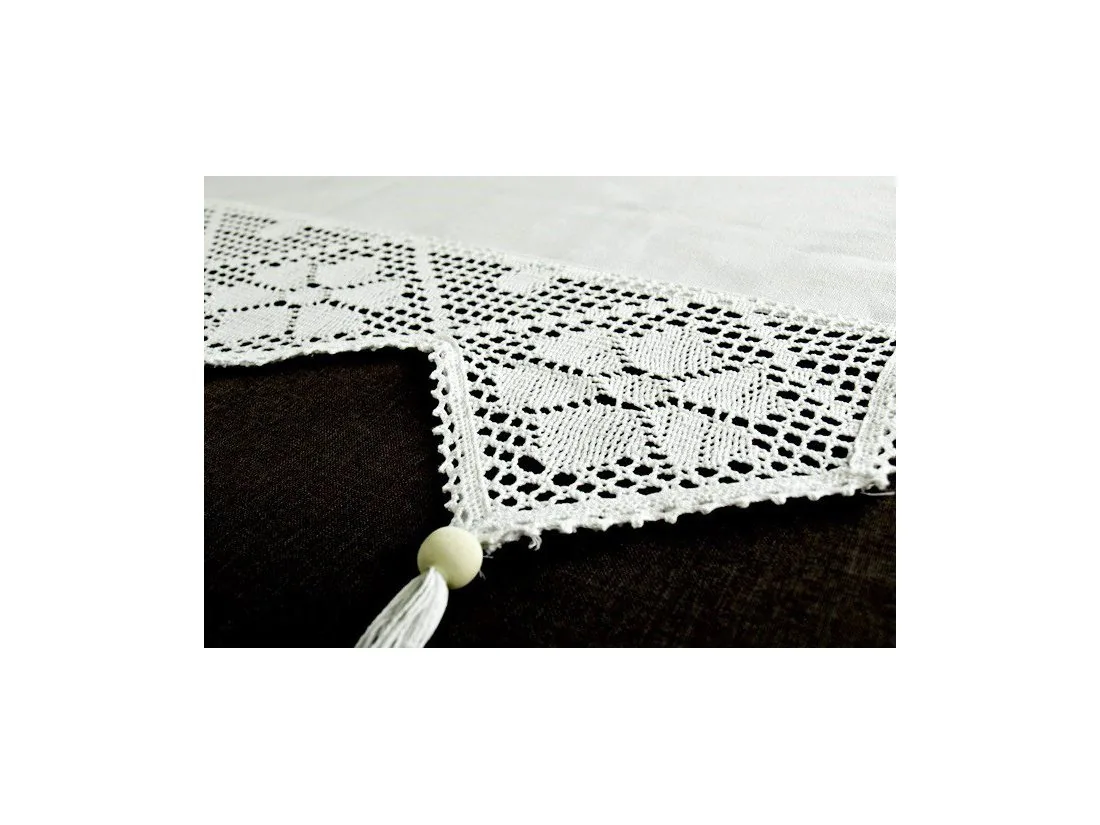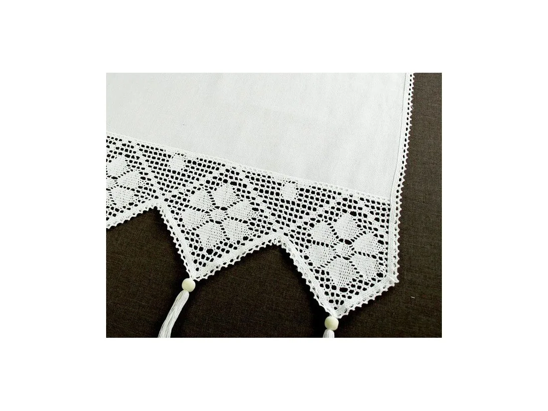 Dekoracyjna zazdrostka w rozmiarze 70 x 100 cm /wys/dł/ w kolorze białym wykończona ozdobną koronką nada niepowtarzalny klimat każdej jadalni, kuchni.