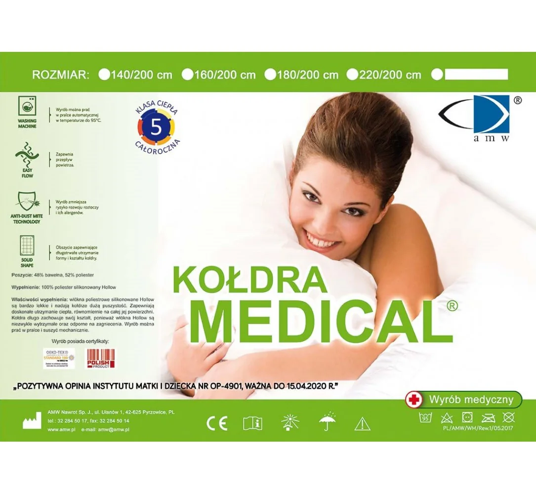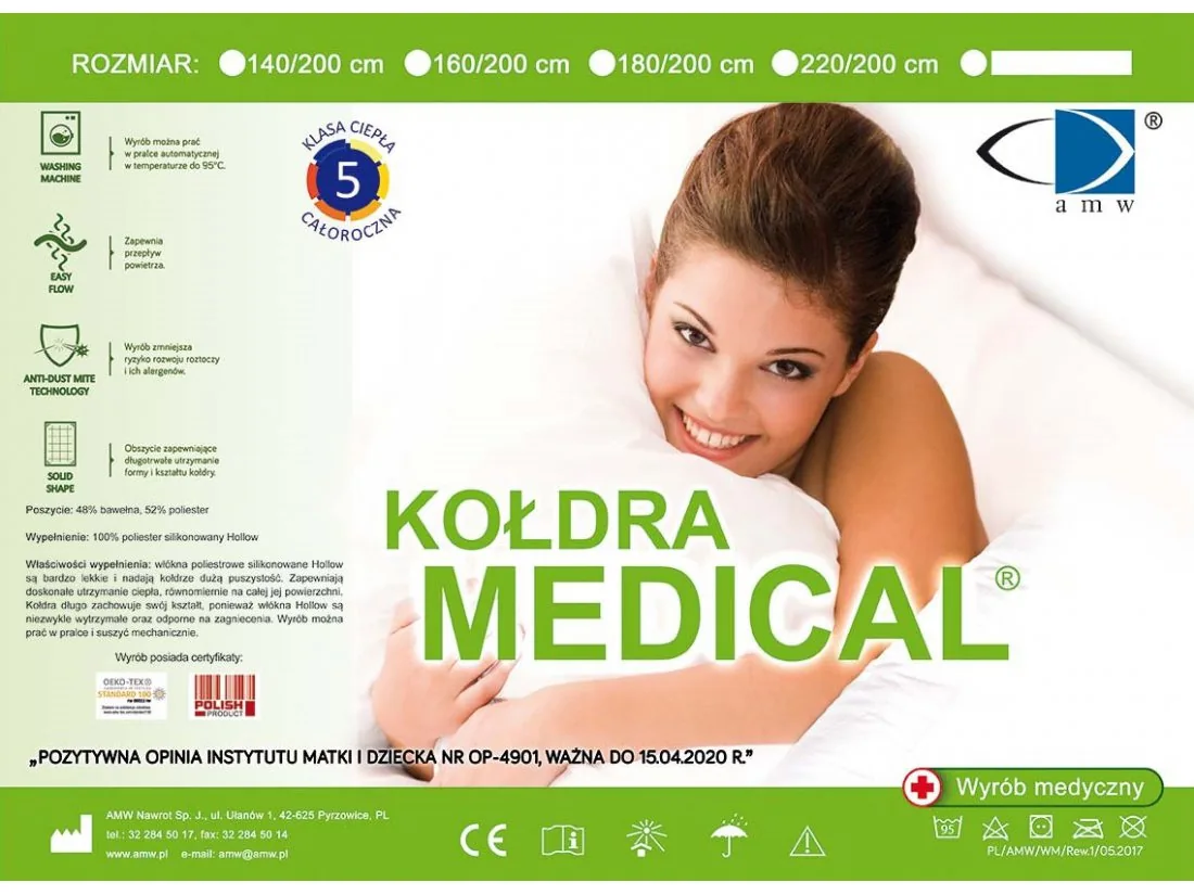 Kołdra całoroczna Medical®+ 200x200 cm antyalergiczna, produkowana przez polskiego producenta AMW, to wysokiej jakości wyrób medyczny. Kołdra ta jest zaprojektowana z myślą o zapewnieniu komfortu i bezpieczeństwa osobom o wrażliwej skórze i skłonności do alergii.