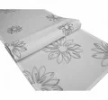 Podkreśl charakter swojej jadalni dzięki bieżnikowi o wymiarach 40x140 cm. Produkt wykonany jest z tkaniny w kolorze śnieżnej bieli, która stanowi jasną i świeżą bazę dla dekoracji. Głównym elementem ozdobnym są duże, **haftowane kwiaty** wykonane nicią w eleganckim, popielatym (szarym) odcieniu. Delikatna struktura haftu nadaje kwiatom trójwymiarowości, tworząc nowoczesny i bardzo estetyczny efekt wizualny.