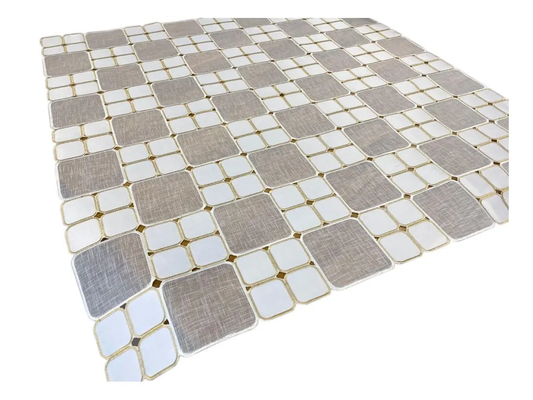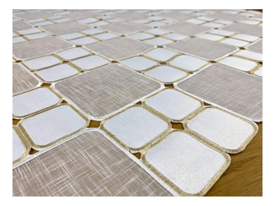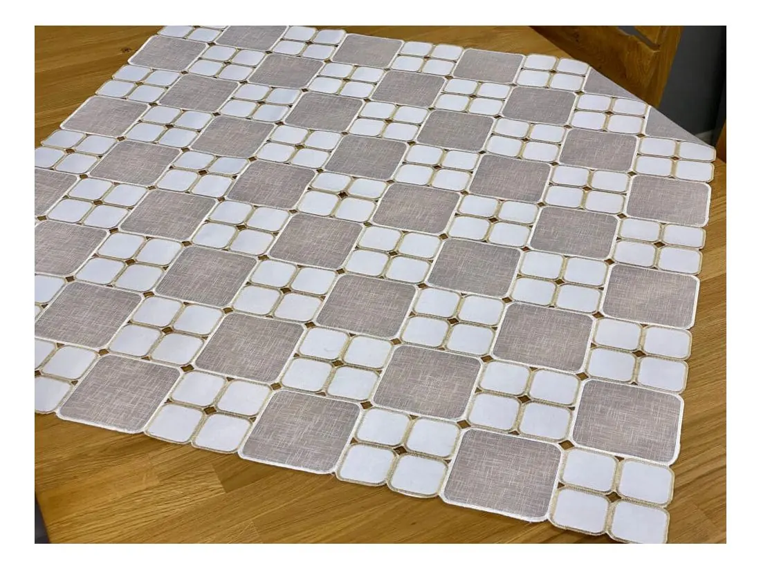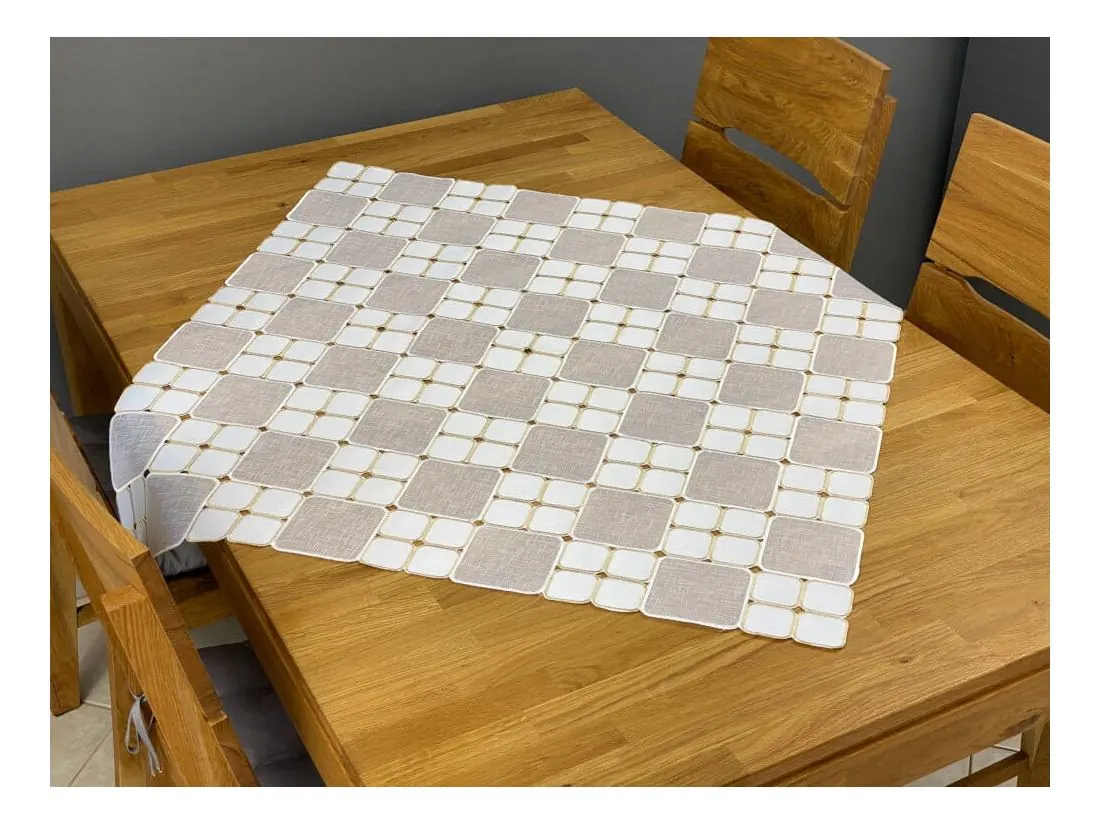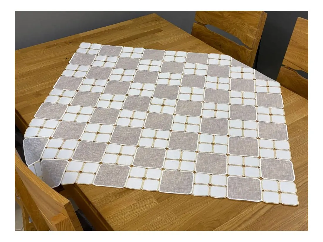 Odkryj wyjątkową nakładkę haftowaną na stół 85x85 cm, która łączy w sobie styl i funkcjonalność. Ten dekoracyjny bieżnik w jasnej kolorystyce tworzy efektowny mozaikowy wzór, subtelnie podkreślając charakter jadalni, salonu lub kuchni. Idealny zarówno do codziennego użytku, jak i na wyjątkowe okazje.