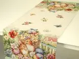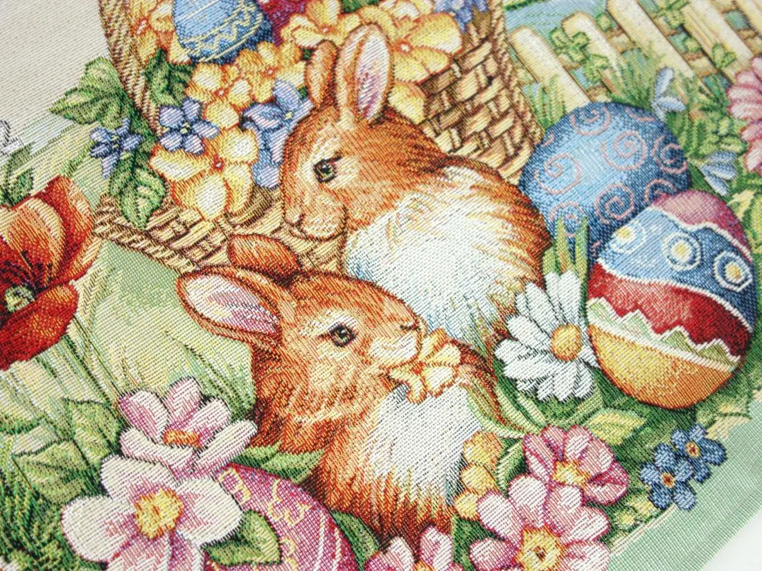 Wielkanocny dekoracyjny bieżnik gobelinowy w rozmiarze 40x140 cm, został wykonany z tkaniny hiszpańskiej 25% bawełna, 70 % poliester, 5% poliakryl - tkanina tkana żakardowa ze wzorem wielkanocnym idealnie podkreślającym magiczny klimat świąteczny.Niepowtarzalne wzornictwo bieżnika gobelinowego z kurką oraz kurczaczkami, podkreśli wystrój każdego wnętrza na czas wielkanocny. Jest to niezastąpiony element do salonu, kuchni, który może odmienić każde wnętrze oraz magicznie podkreślić jego wystrój. Wzornictwo nawiązuje do tradycyjnych gobelinów które dawniej zdobiły ściany w domach. Zastosowana tkanina jest tkana, gruba, nie gniecie. Różnorodność wzorów na poszewkach gobelinowych zadowoli każdego kto pragnie aby w jego pomieszczeniu zagościł niepowtarzalny magiczny sielski klimat.