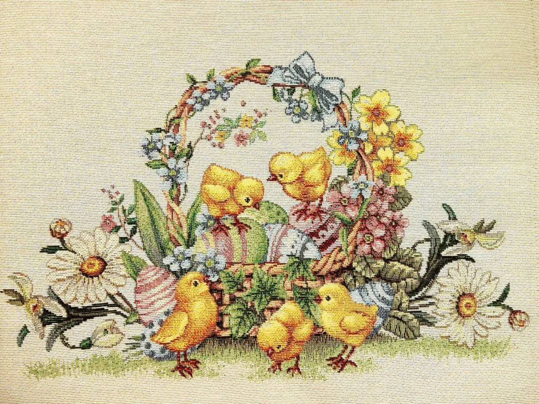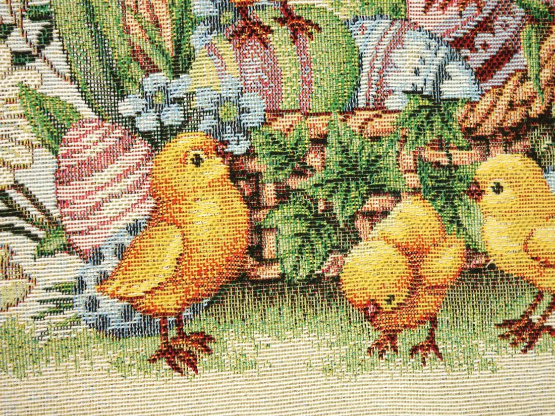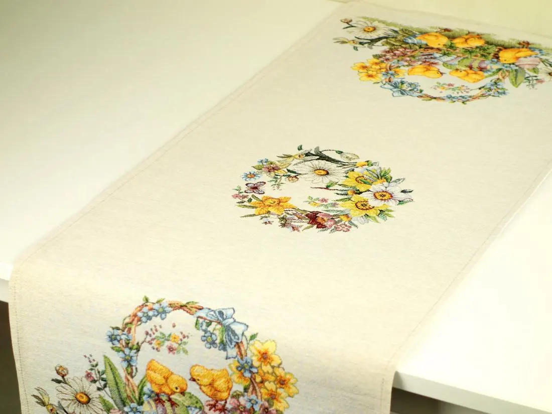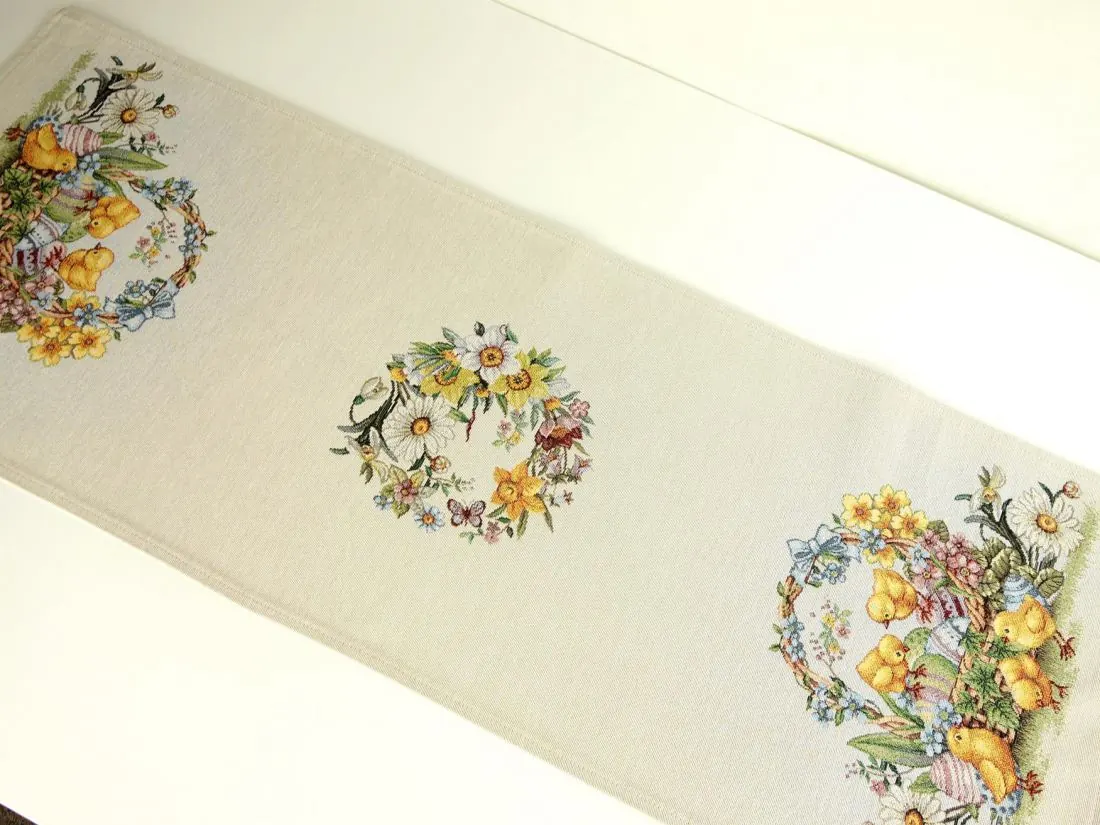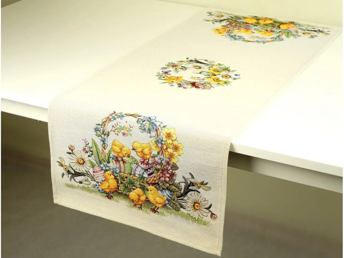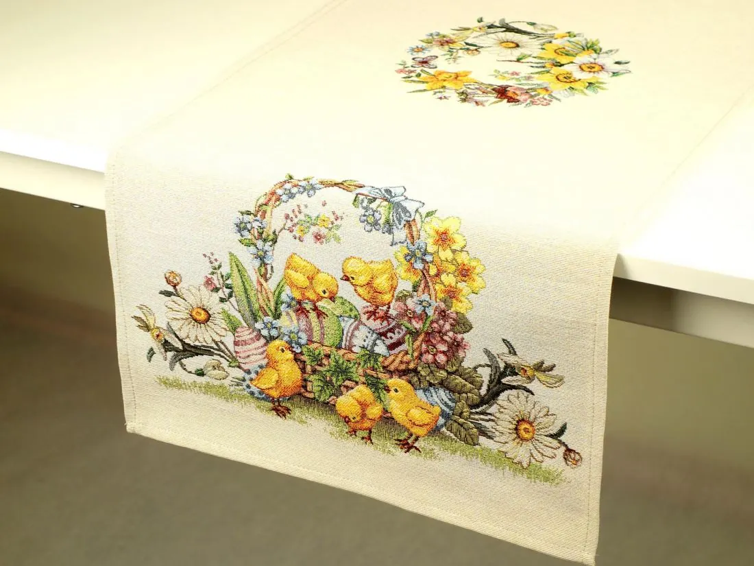 Wielkanocny dekoracyjny bieżnik gobelinowy w rozmiarze 40x140 cm, został wykonany z tkaniny hiszpańskiej 25% bawełna, 70 % poliester, 5% poliakryl - tkanina tkana żakardowa ze wzorem wielkanocnym idealnie podkreślającym magiczny klimat świąteczny.Niepowtarzalne wzornictwo bieżnika gobelinowego z kurczaczkami, kolorowymi pisankami podkreśli wystrój każdego wnętrza na czas wielkanocny. Jest to niezastąpiony element do salonu, kuchni, który może odmienić każde wnętrze oraz magicznie podkreślić jego wystrój. Wzornictwo nawiązuje do tradycyjnych gobelinów które dawniej zdobiły ściany w domach. Zastosowana tkanina jest tkana, gruba, nie gniecie. Różnorodność wzorów na poszewkach gobelinowych zadowoli każdego kto pragnie aby w jego pomieszczeniu zagościł niepowtarzalny magiczny sielski klimat.