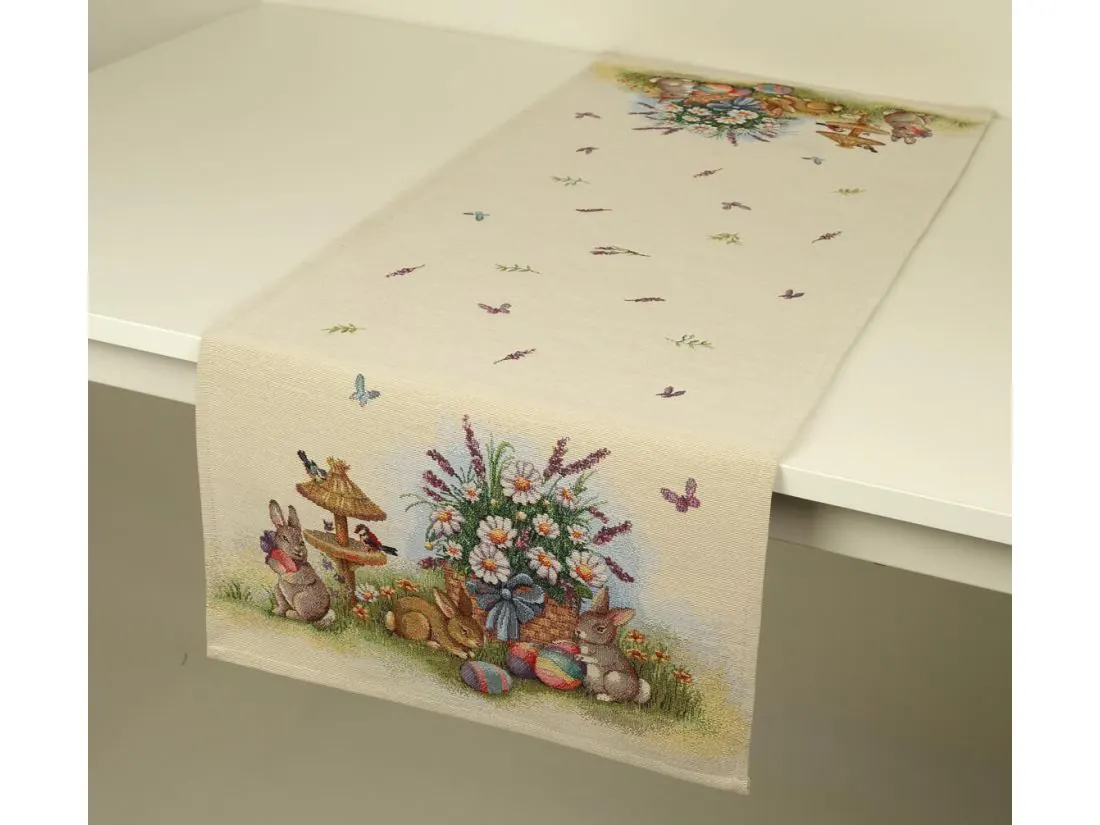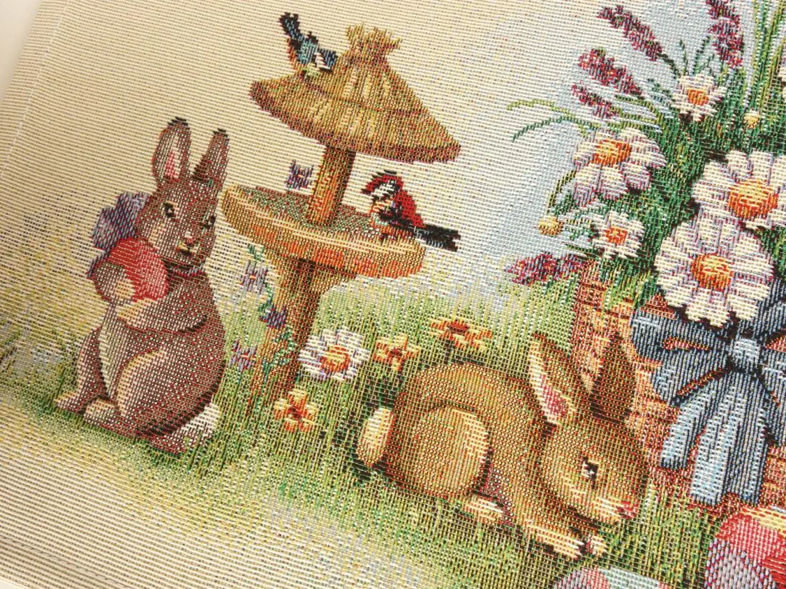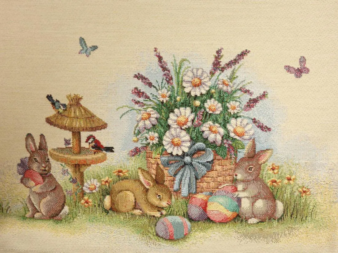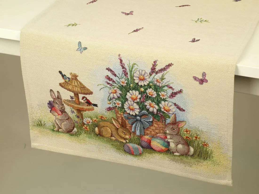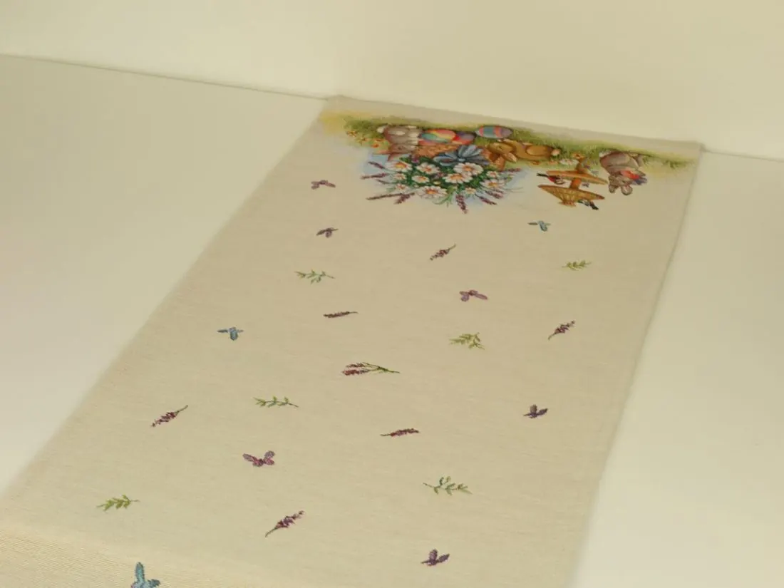 Wielkanocny dekoracyjny bieżnik gobelinowy w rozmiarze 50x100 cm, został wykonany z tkaniny hiszpańskiej 25% bawełna, 70 % poliester, 5% poliakryl - tkanina tkana żakardowa ze wzorem wielkanocnym idealnie podkreślającym magiczny klimat świąteczny.Niepowtarzalne wzornictwo bieżnika gobelinowego z wesołymi zajączkami, kolorowymi pisankami podkreśli wystrój każdego wnętrza na czas wielkanocny. Jest to niezastąpiony element do salonu, kuchni, który może odmienić każde wnętrze oraz magicznie podkreślić jego wystrój. Wzornictwo nawiązuje do tradycyjnych gobelinów które dawniej zdobiły ściany w domach. Zastosowana tkanina jest tkana, gruba, nie gniecie. Różnorodność wzorów na poszewkach gobelinowych zadowoli każdego kto pragnie aby w jego pomieszczeniu zagościł niepowtarzalny magiczny sielski klimat.