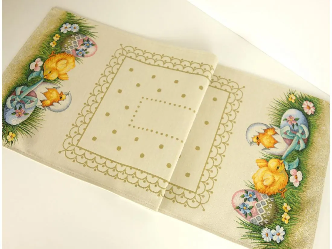 Wielkanocny dekoracyjny bieżnik gobelinowy w rozmiarze 45x140 cm, został wykonany z tkaniny hiszpańskiej 25% bawełna, 70 % poliester, 5% poliakryl - tkanina tkana żakardowa ze wzorem wielkanocnym idealnie podkreślającym magiczny klimat świąteczny.Niepowtarzalne wzornictwo bieżnika gobelinowego z kurczaczkami, kolorowymi pisankami podkreśli wystrój każdego wnętrza na czas wielkanocny. Jest to niezastąpiony element do salonu, kuchni, który może odmienić każde wnętrze oraz magicznie podkreślić jego wystrój. Wzornictwo nawiązuje do tradycyjnych gobelinów które dawniej zdobiły ściany w domach. Zastosowana tkanina jest tkana, gruba, nie gniecie. Różnorodność wzorów na poszewkach gobelinowych zadowoli każdego kto pragnie aby w jego pomieszczeniu zagościł niepowtarzalny magiczny sielski klimat.