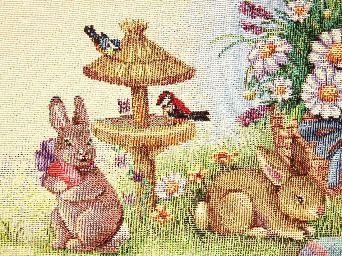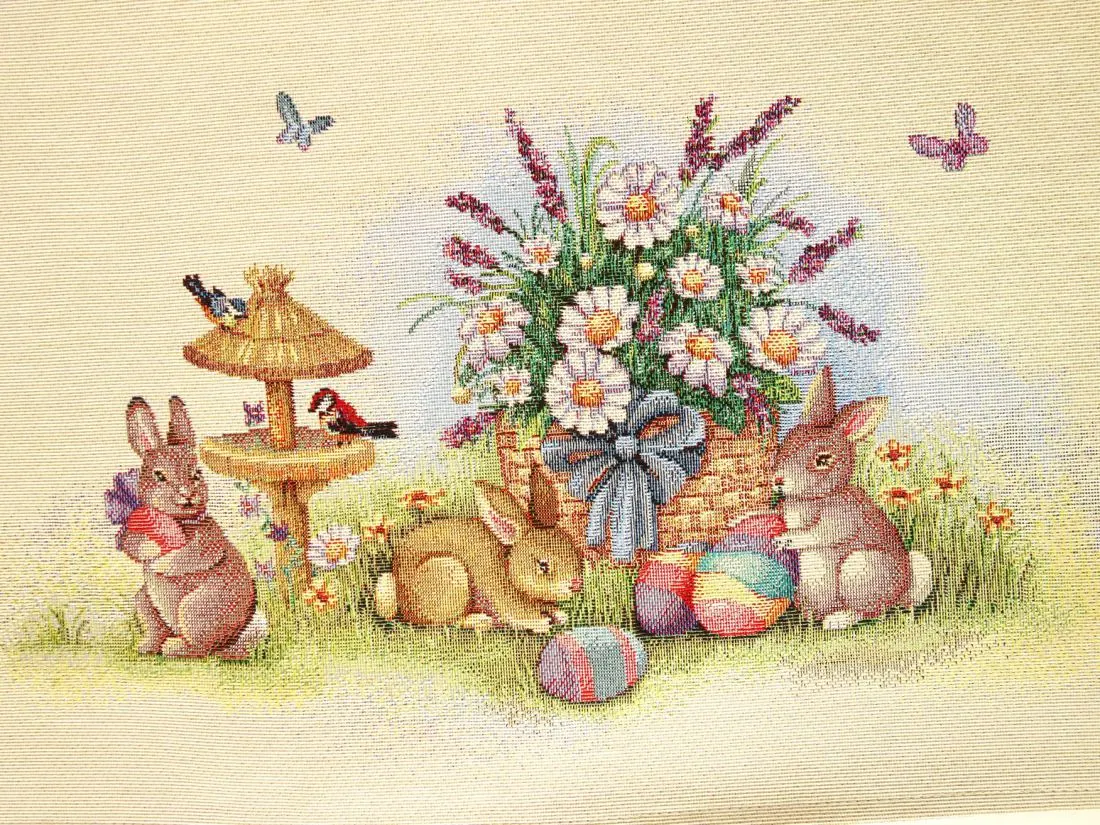 Wielkanocny dekoracyjny bieżnik gobelinowy w rozmiarze 45x140 cm, został wykonany z tkaniny hiszpańskiej 25% bawełna, 70 % poliester, 5% poliakryl - tkanina tkana żakardowa ze wzorem wielkanocnym idealnie podkreślającym magiczny klimat świąteczny.Niepowtarzalne wzornictwo bieżnika gobelinowego z wesołymi zajączkami, kolorowymi pisankami podkreśli wystrój każdego wnętrza na czas wielkanocny. Jest to niezastąpiony element do salonu, kuchni, który może odmienić każde wnętrze oraz magicznie podkreślić jego wystrój. Wzornictwo nawiązuje do tradycyjnych gobelinów które dawniej zdobiły ściany w domach. Zastosowana tkanina jest tkana, gruba, nie gniecie. Różnorodność wzorów na poszewkach gobelinowych zadowoli każdego kto pragnie aby w jego pomieszczeniu zagościł niepowtarzalny magiczny sielski klimat.