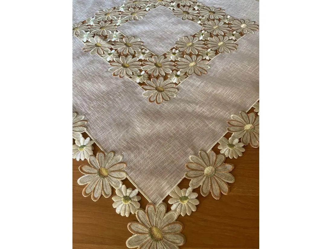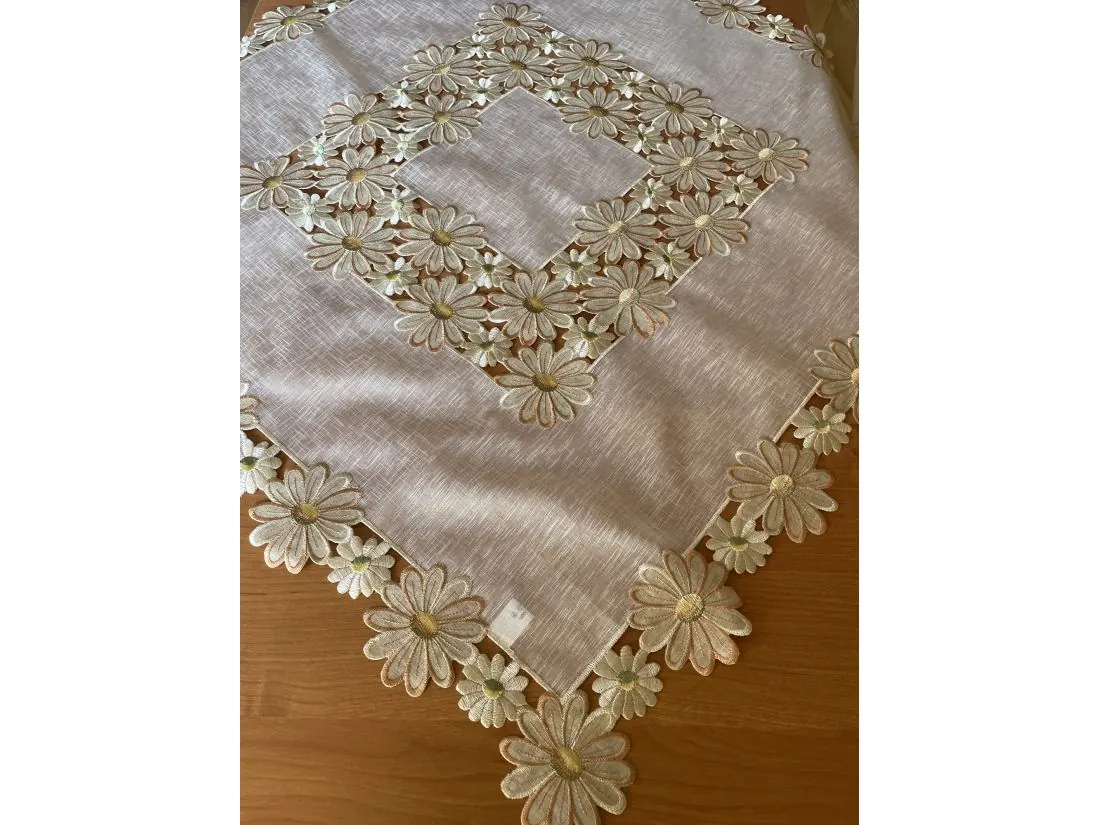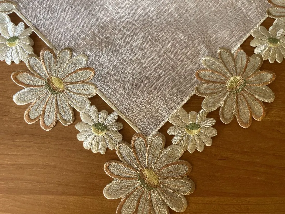 Bieżnik haftowany 85x85 cm beżowe margaretki – Elegancka serweta z organtyny