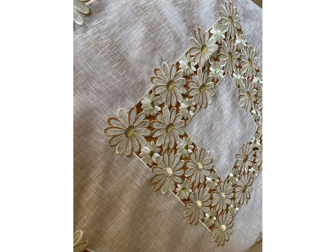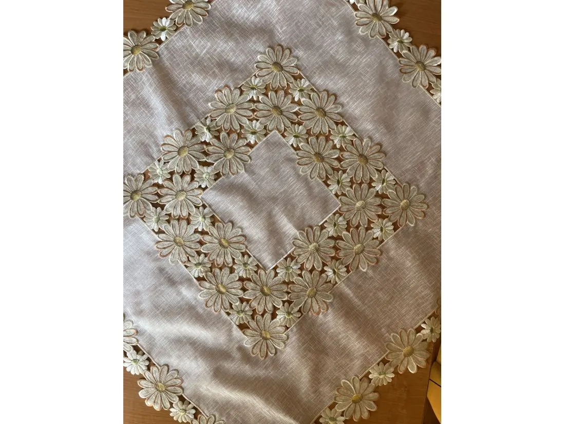 - Kunsztowny haft ażurowy: Brzegi oraz środek nakładki zdobią gęsto rozmieszczone haftowane margaretki. Zastosowanie techniki ażurowej nadaje bieżnikowi lekkości i sprawia, że wygląda on jak precyzyjne rękodzieło.