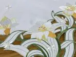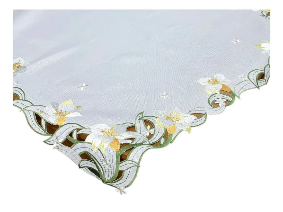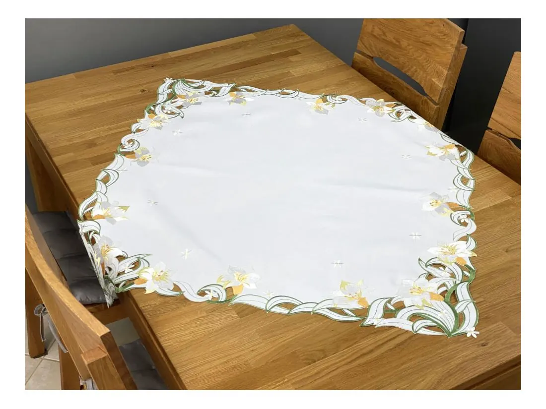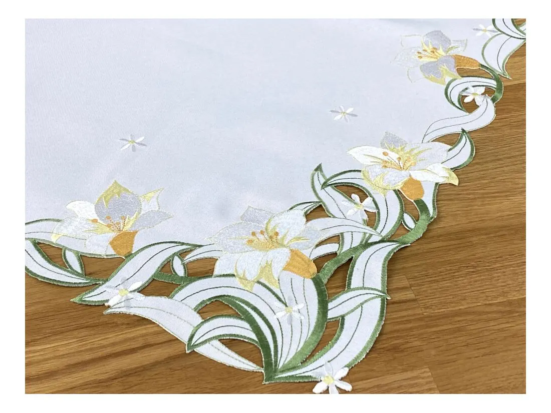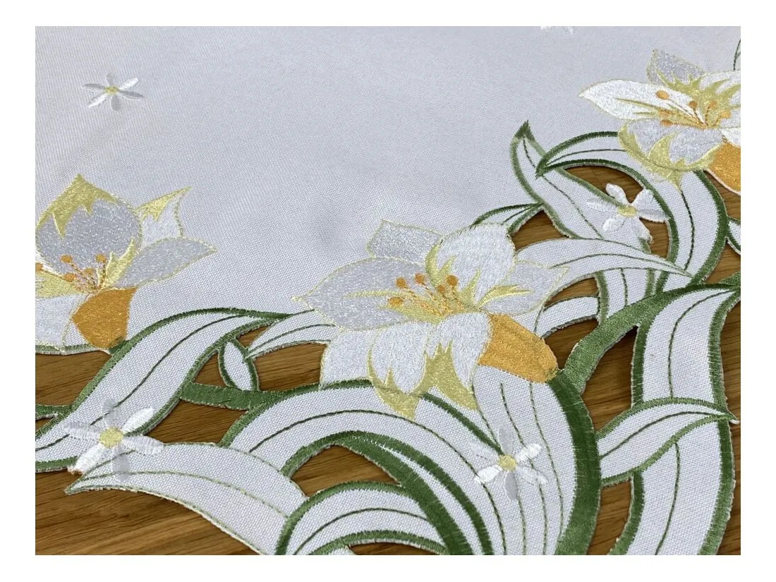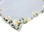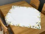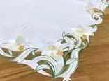 Haftowany kwadratowy bieżnik w rozmiarze 85x85 cm w kolorze białym z haftowanymi wiosennymi żonkilami.