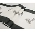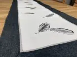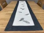 - Bieżnik nowoczesny dekoracyjny: Unikalny haft w motywie piórek w kolorze szaro-popielatym nadaje mu lekkości i artystycznego wyrazu.
