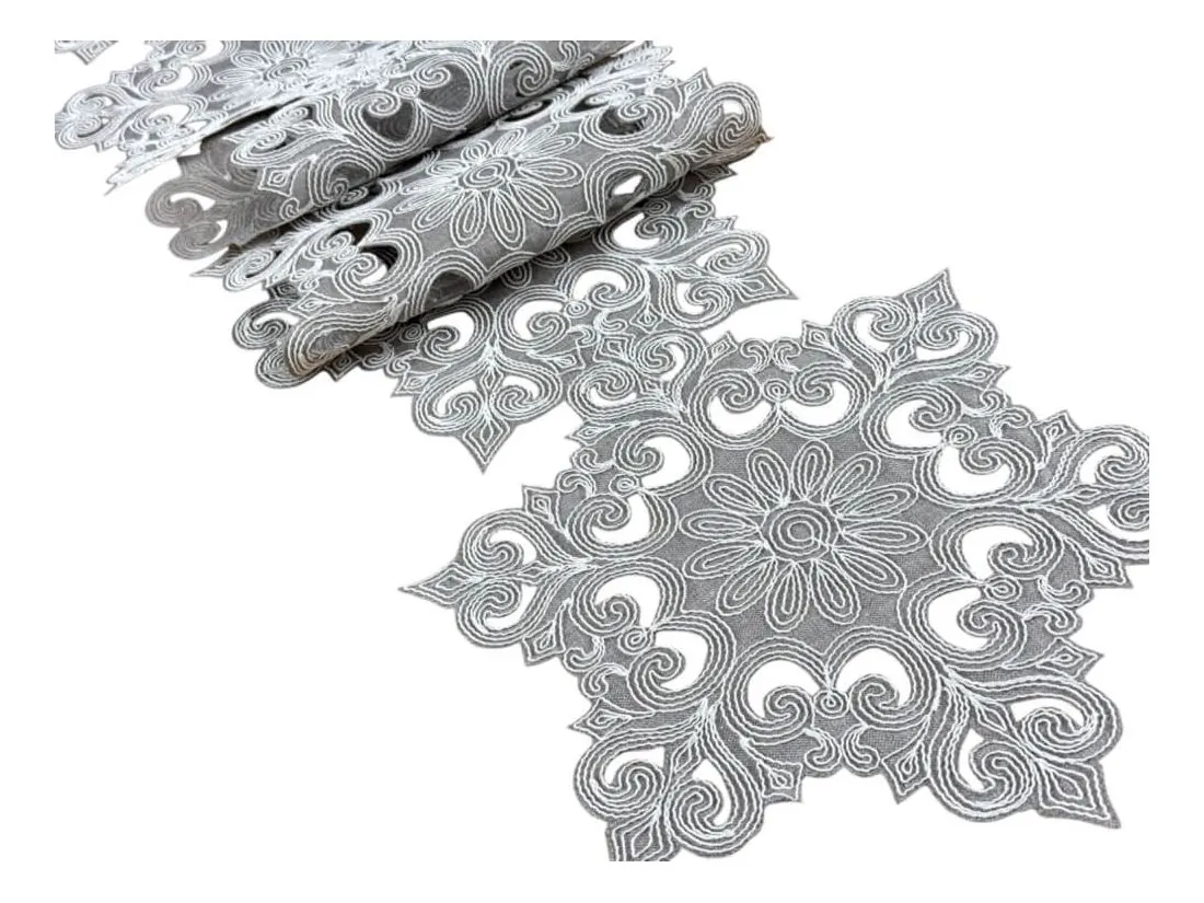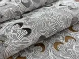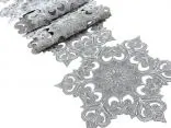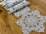 Elegancki szary bieżnik świąteczny z poliestru, ozdobiony subtelnym, jasnym haftem, to doskonały sposób na wprowadzenie do wnętrza świątecznego blasku. Materiał z dodatkiem lurexu, z drobnymi srebrnymi nićmi, delikatnie połyskuje w świetle, nadając bieżnikowi wyjątkowy, brokatowy efekt.