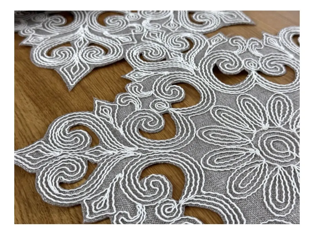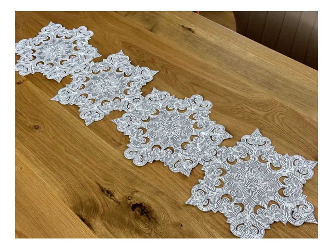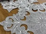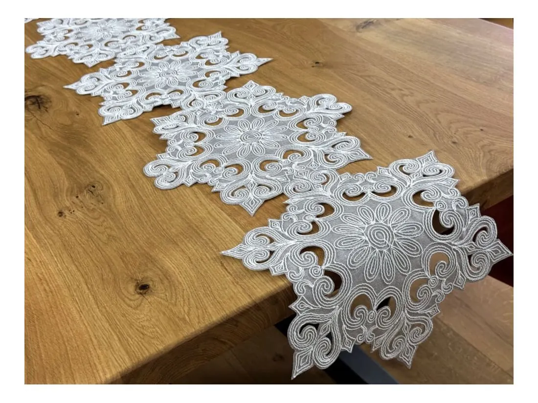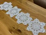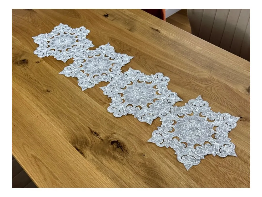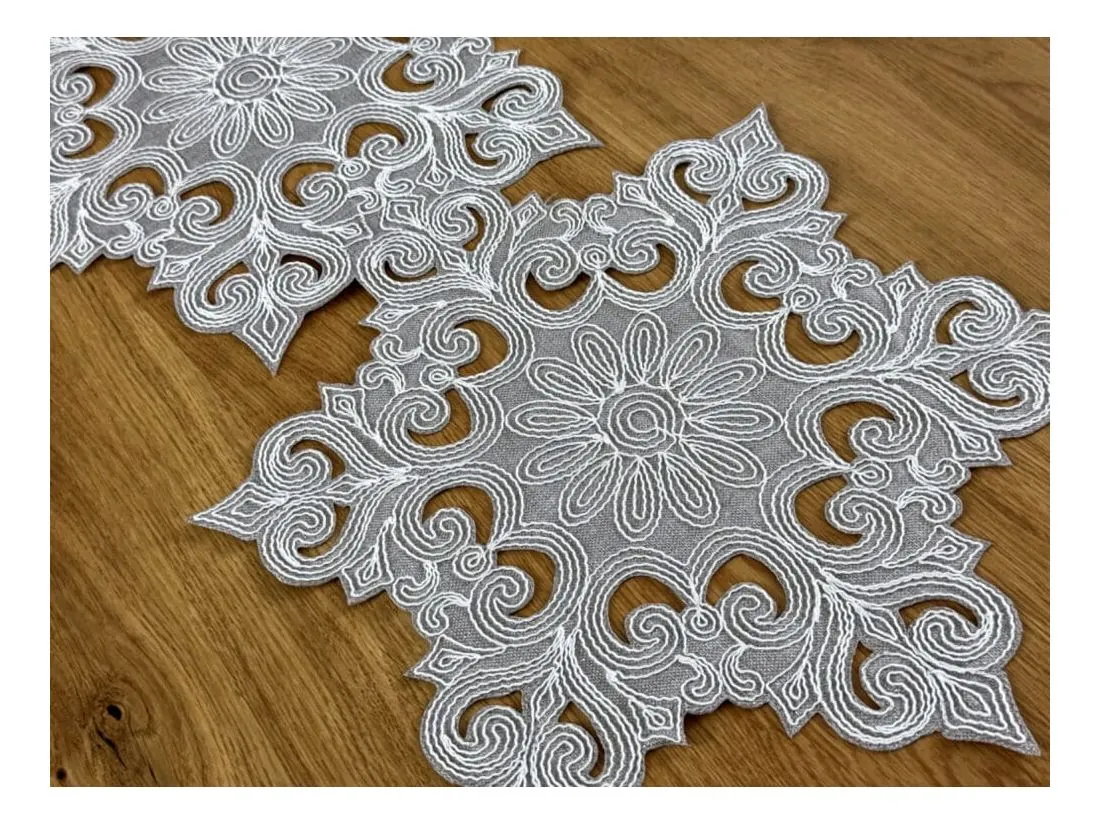 Jasny haft tworzy wyrafinowany wzór, który harmonijnie współgra z neutralnym szarym odcieniem tkaniny. Ten stylowy bieżnik to idealna ozdoba na Boże Narodzenie, która podkreśli elegancję stołu i wniesie nutę świątecznego uroku do każdego wnętrza.