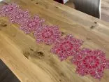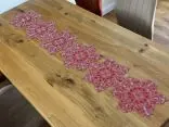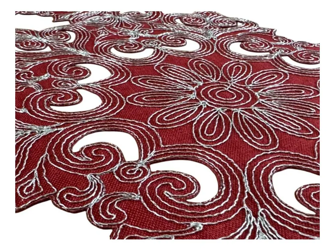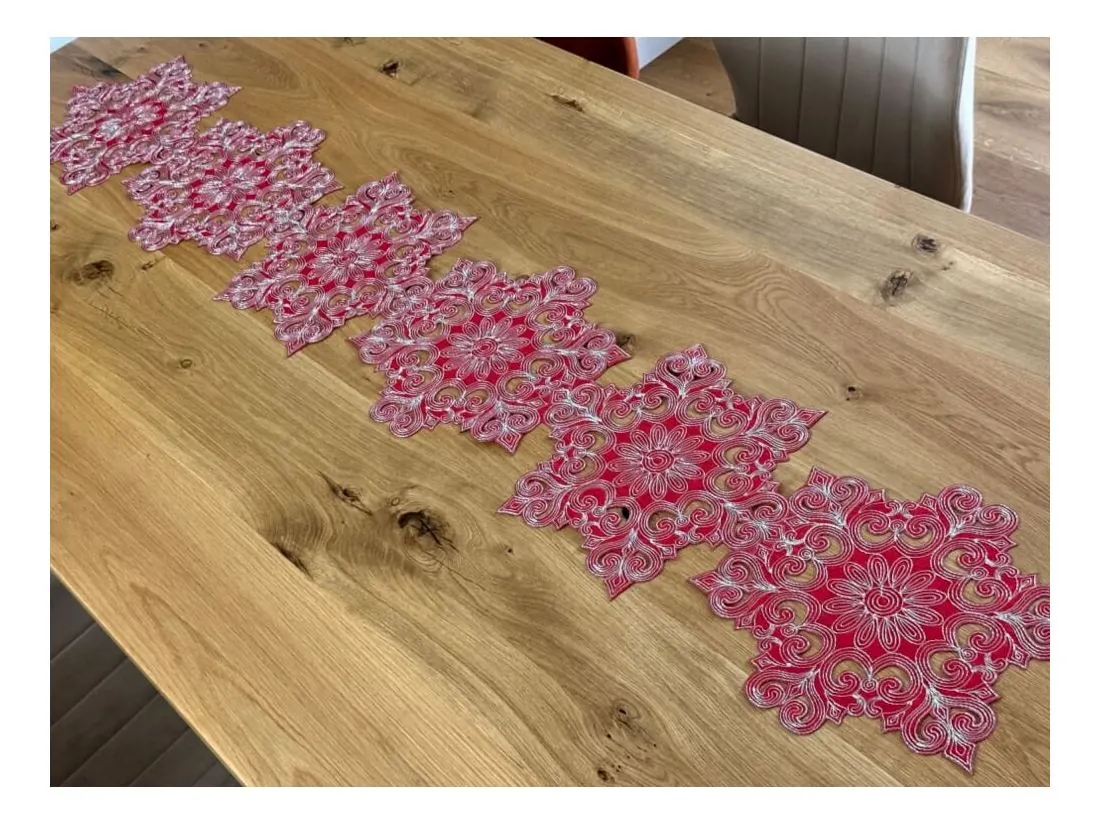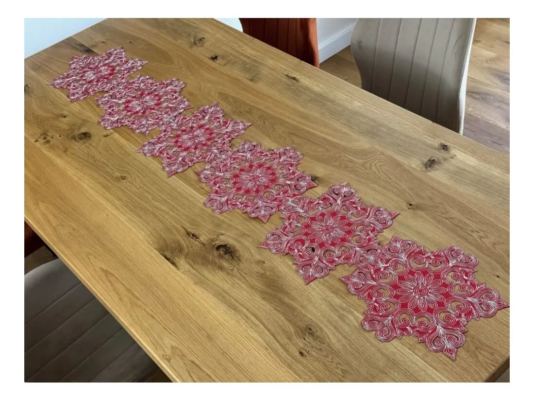 Starannie wyhaftowany srebrny wzór doskonale współgra z intensywną czerwienią materiału, tworząc stylowy akcent na stole. Ten bieżnik to idealny wybór na czas Bożego Narodzenia, przyciągający wzrok i podkreślający wyjątkowy charakter świątecznych chwil.