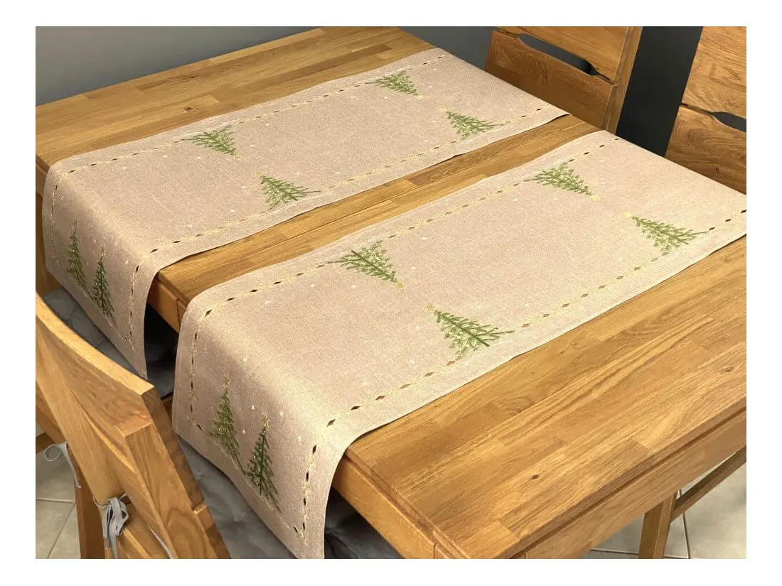 Bieżnik świąteczny w rozmiarze 40x140 cm w kolorze beżowym z bogato zdobioną aplikacją zielonych choinek w otoczeniu złotych gwiazdek, została wykonana na tkaninie 100 % poliestrowej, charakteryzuje się nowoczesnym designem, świątecznym wzorem oraz modnym kolorem. Dodatkową ozdobą nakładki są wycięcia wzdłuż bieżnika w formie złotego łańcuszka z magicznych gwiazdek
